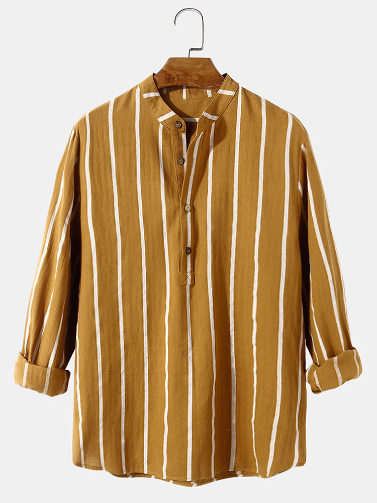 100% Cotton Mens Classic Stripe Print Long Sleeve Henley Shirts – S Yellow