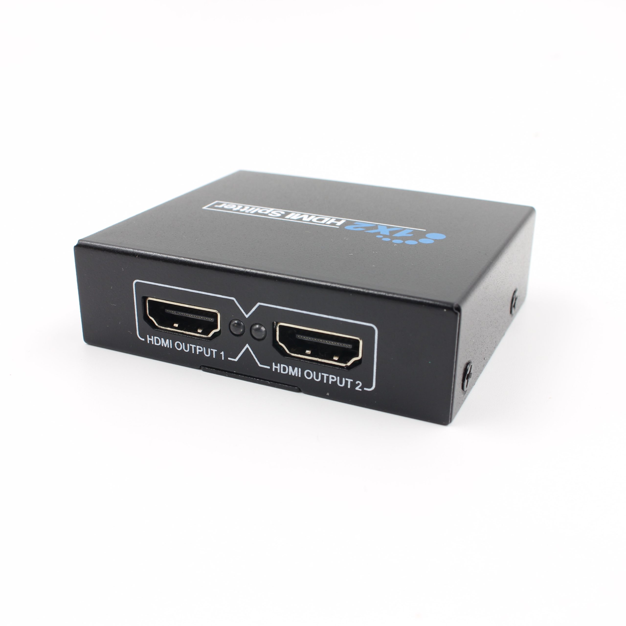 This compact HDMI splitter can reliably distribute a single HDMI source to two synchronized outputs. More outputs can be created by cascading multiple splitters.