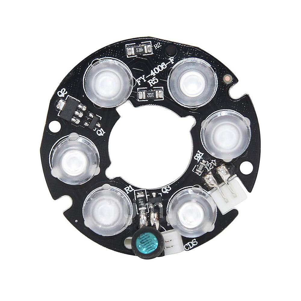 . Fonctionnalites: - Cartes haute puissance / Spot Light / Infrarouge IR LED pour la vision nocturne des cameras CCTV. - Carte pilotee et capteur CDS inclus. - L'alimentation depasse DC13V peut reduire considerablement la duree de vie des LED. - La carte de lampe est livree avec une interface 5V (1.25-2P) de commutateur de filtre double IR-CUT, sans fils de soudure. Caracteristiques: Numero de LED: 6pcs array LED Diametre du panneau: 45 mm Diametre interieur: 17 mm Alimentation: DC12V / 300-400mA (typique) Lumieres IR Longueur d'onde: 850 nm Puissance infrarouge: 2,5 W Distance de vision nocturne: 30-40 metres Objectif adaptateur: 4 mm, 6 mm, 8 mm, 12 mm, 16 mm Angle de la coupelle lumineuse: 30, 45, 60, 80 degres Temperature de fonctionnement: -10 ? e + 5010 ? Emballage inclus: 10 x 6 * array IR LED Board for CCTV Camera Night Vision