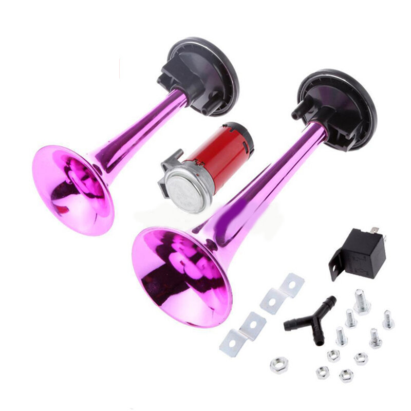 Feature: 1.Loud and powerful Twin-Tone Air Horns add a level of safety to your driving with 178db of sound. 2.Two rose red trumpet style horns included air compressor for a distinctive and stylish look. 3.Kit includes one high-tone air horn, one low-tone air horn, one high-performance air compressor, one 12V relay, mounting brackets, and mounting instructions. 4.Professional installation to ensure safe fitment. 5.Suitable for all 12V vehicles such as cars, boats etc. Specification: Material: Metal Color: Black,Blue,Red,Yellow Quantity: 1pc Voltage: 12V DB Output: 178db Package Included: 1 X Double Air Horn 1 X Packet Of Mounting Bracket And Hardware , , , , , ,