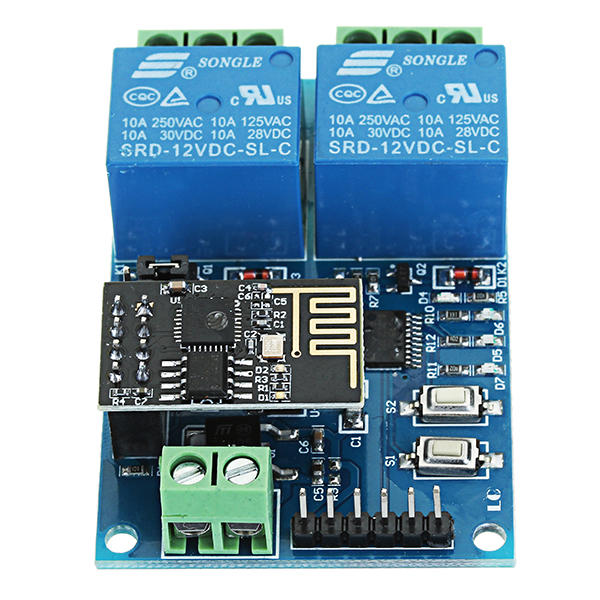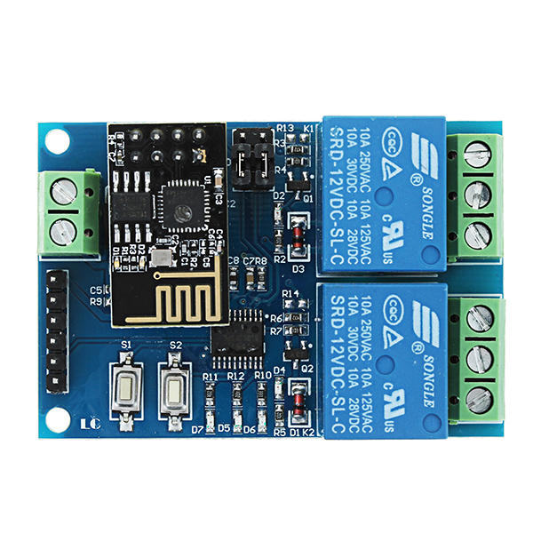 12V ESP8266 Module de relais WIFI 2 canaux equipe d'un module WIFI ESP-01 et d'un microcontreleur haute performance 8 bits, necessite seulement des configurations simples et vous pouvez ensuite contreler le relais avec l'application telephone portable sous LAN.