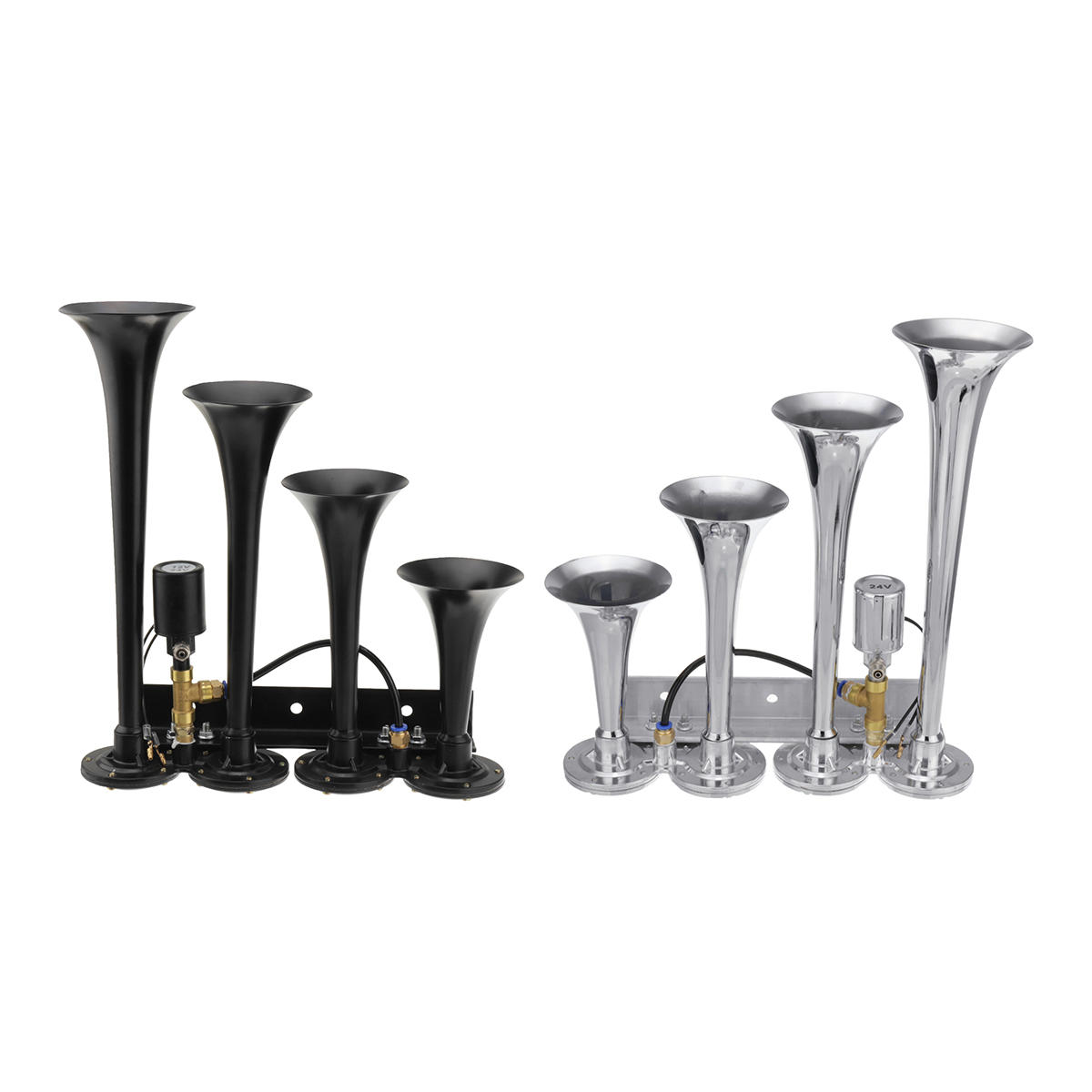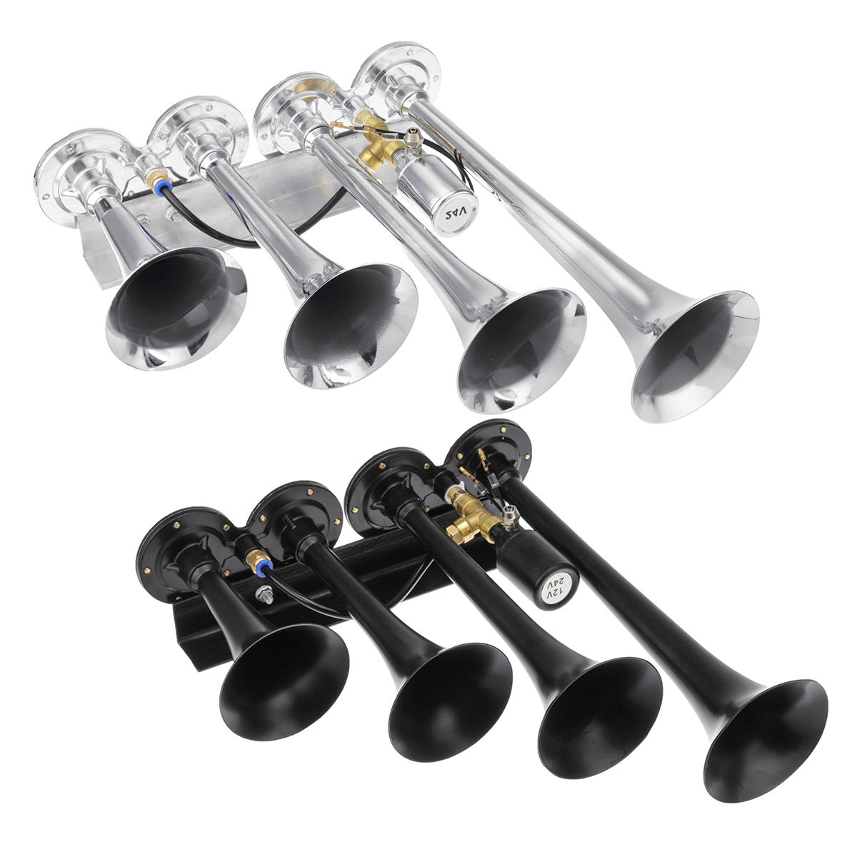 Feature: 1.Sound output 149dB, Four Durable Trumpets. 2.Hard, tough, high quality guarantees long service life. 3.Loud enough to help you warnning that people who isn't aware of your car coming. 4.You can broadcast the you like with this product. 5.You can use them as a trim. Specification: Horn Type: 4 Trumpets Material: Metal Color: Silver,Black Sound Output: 149dB Operating Pressure: 60-150 psi Caliber: 90 mm Voltage: 12,24 V Appearance size: 34.5 x 30 x 10 cm Fitment: Universal fit most of cars, trucks, boats, trailers, train, steamer, etc. Package Included: 4 X Metal Trumpets Some accessories