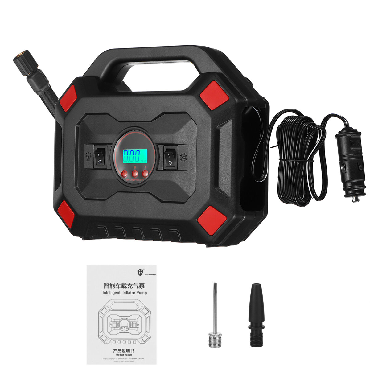 Feature: 1. Multi-Purpose Tyre pump comes with 3 different adapter, which makes it perfect for cars, bikes, motorcycles, RV, SUV, ATV and truck. Also, sports equipment and inflatables adaptors included. 2. Fast Inflating Automatically and rapidly inflated in 3 minutes. One-touch switch Just press start to start work, press close to stop, make air compressor pump convenient to use. 3. Tire Pressure Gauge&LED Flashlight The car tyre compressor and LED light, you can check the tire pressure at any time. Long-lasting LED lights allow easy operation or making quick repairs in the dark. 4. Space-Saving Portable air compressor with portable compact design makes it easy to lift, easy to carry around, keep this mini air compressor and tire air inflator in your trunk, use it anytime you need. 5. Powerful Max Inflatable Pressure 150PSI automobile tire air pump delivers inflating air at impressive rate of 35 L,min, much more powerful and fast than traditional pump. 6. Long Power Cord With 10ft long power cord, Air Compressor Pump allows to reach all tires of your car, bike, motorcycle, ATV, compact or midsize SUV NOT SUPPORT ANY Truck or Motor Lorry . Specification: Product function Inflation, tire pressure measurement, lighting Input voltage 12V Working voltage DC12V Power 120W Air Flow 35L,min Inflation efficiency 185,70R14 Max. Pressure 150PSI Pressure unit PSI, BAR, KG,CM² Working temperature 0?-60? Inflatable tube length 37cm,14.6 Cable length 3M,10ft Size 20.5x7x18cm,8.1x2.8x7.1 Safety and Durable Pass multi