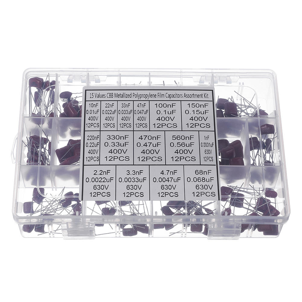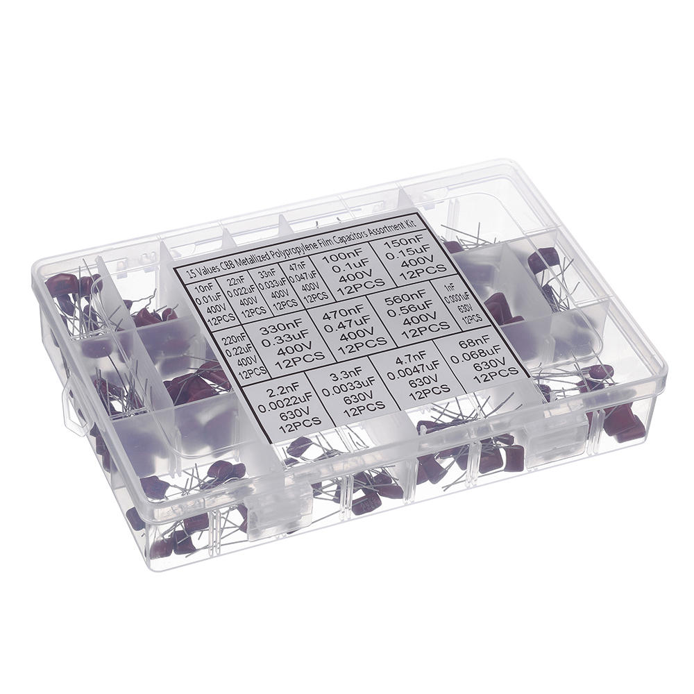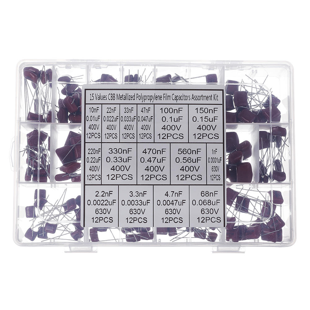 180 pieces 15 valeurs 10nf 400V-68nf 630V CBB Kit d’assortiment de condensateurs e Film metallique avec boete de rangement