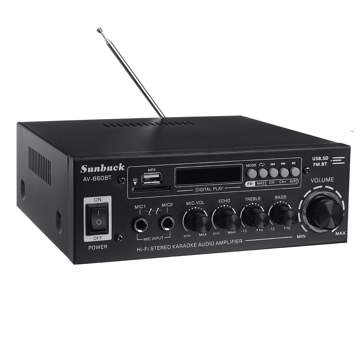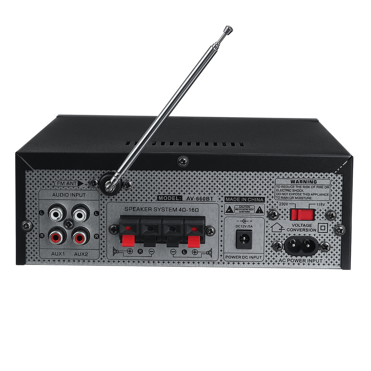 . Traits: Un ensemble de haut-parleurs est un amplificateur approprie pour les petites fetes Deux entrees de signal: signal DVD et signal AUX Conversion de puissance 115V / 230V Avec telecommande Bluetooth 5.0 Avec radio FM Table de mixage EQ 5 bandes Reverberation, reglage fin, equilibre SD, interface USB, 2 entrees micro. Wavec reglage de la reverberation et du retard du microphone Modele: AV-660BT Taille: 200 * 70 * 190mm / 7.9x2.8x7.5 " Tension: conversion 115V / 230V, DC12V Puissance nominale: 1200 W Pic: 2000W Frequence nominale: 20KH - 20KHz Rapport signal / bruit: 90dB Impedance standard: 4 e 16 ohms Type d'amplificateur de puissance: amplificateur de puissance AV Canal: canal 2.0 Distorsion harmonique totale: = 0,5% Sensibilite d'entree du signal: 200mv (e 30mv) Sensibilite d'entree du microphone: 9 mv (e 2 mv) Niveau de sortie d'enregistrement: 1 V Sortie de niveau auxiliaire: 1 V Prise en charge: disque USB / carte SD Max 64GB (non incluse) Couleur: noir, blanc Re : 1. Le disque USB / carte SD Max 64GB n'est pas inclus dans l'emballage 2. Veuillez permettre des differences de 0,5 e 1 cm en raison de la mesure manuelle. 3. En raison de la difference de lumiere et d'ecran, la couleur de l'article peut etre legerement differente de celle des images. Package Iinclus: 1 x amplificateur de puissance audio 1 x telecommande 1 x manuel de l'utilisateur