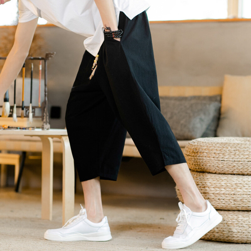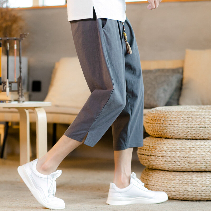 2019 summer new cotton and linen cropped pants drawstring casual pants shorts loose solid color linen thin pants male – 3XL Dark Gray