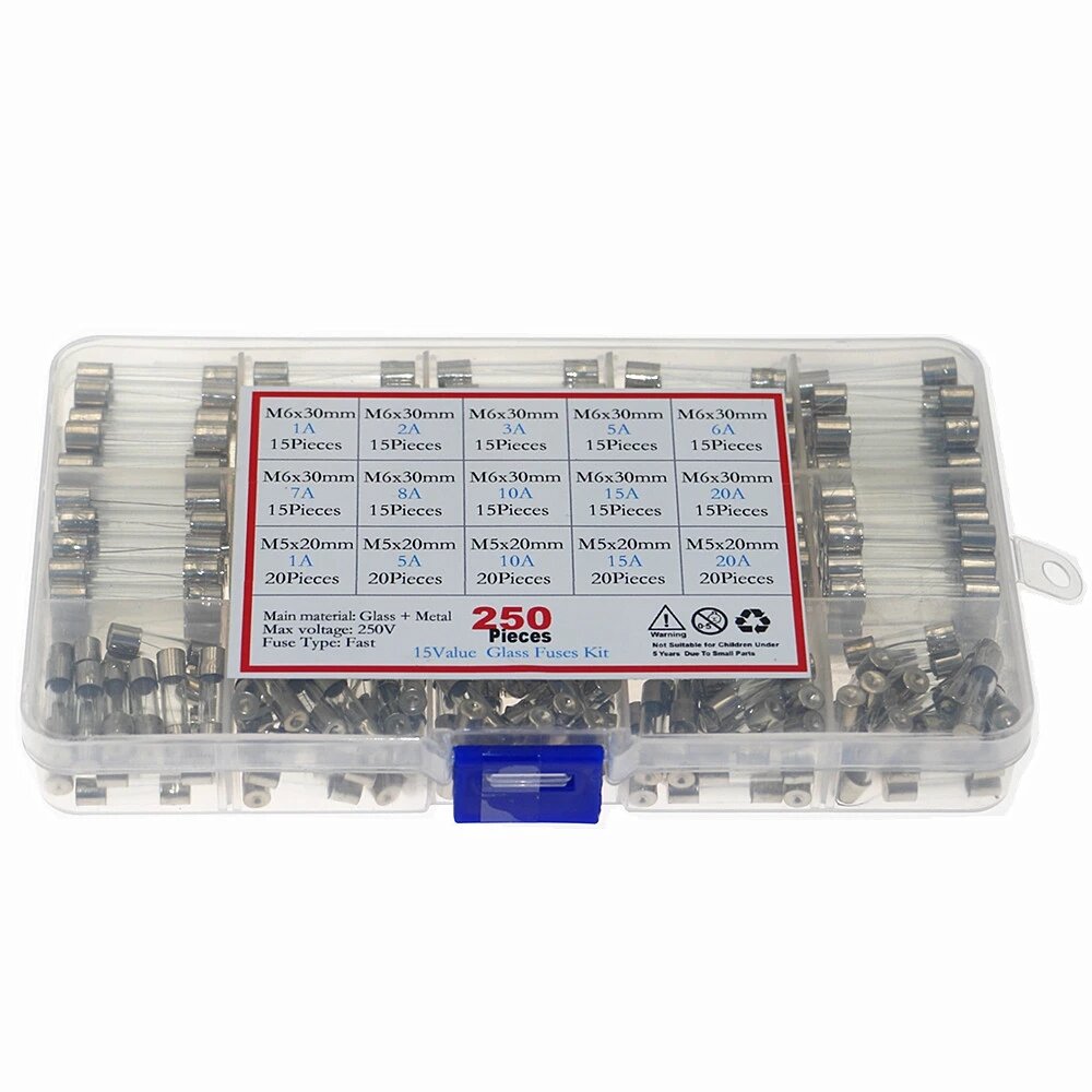 250 pieces 5x20mm 6x30mm 1-20A 250V Kit de fusibles assortis Tube de verre e soufflage rapide Kit de fusibles en verre e soufflage rapide avec boete
