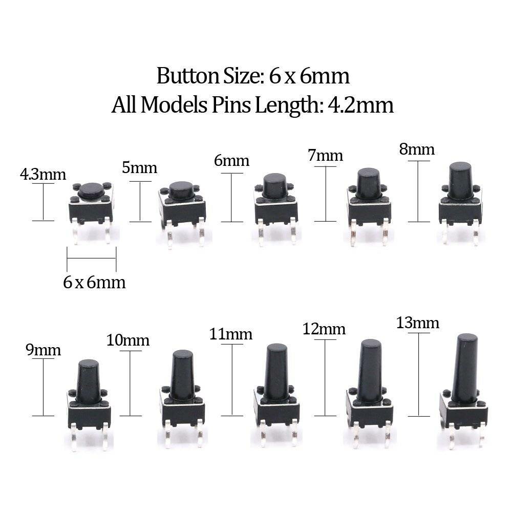 . Caracteristiques: Type de contact: contact momentane; Estimation actuelle: 50mA; Tension nominale: DC 12 V; Resistance de contact: 100M Ohm; Materiel: plastique, metal; Taille du commutateur: 6 x 6 mm, 12 x 12 mm; Taille du bouton: 4,3 mm / 5 mm / 6 mm / 7 mm / 8 mm / 9 mm / 10 mm / 11 mm / 12 mm / 13 mm. Caracteristiques: - Fonction de contact momentane, 4 broches, bouton-poussoir rond noir, montage traversant. - Utilise dans les domaines des produits electroniques, des appareils menagers et plus encore. - La conception du mecanisme de haute precision offre un fonctionnement aigu et une longue duree de vie. - Emballe dans un etui de rangement en plastique refermable pratique et robuste. Emballage inclus: 6 x 6 x 4,3 - 15 pieces 6 x 6 x 5 - 15 pieces 6 x 6 x 6 - 15 pieces 6 x 6 x 7 - 15 pieces 6 x 6 x 8 - 15 pieces 6 x 6 x 9 - 15 pieces 6 x 6 x 10 - 15 pieces 6 x 6 x 11 - 15 pieces 6 x 6 x 12 - 15 pieces 6 x 6 x 13 - 15 pieces 12 x 12 x 4,3 - 10 pieces 12 x 12 x 5 - 10 pieces 12 x 12 x 6 - 10 pieces 12 x 12 x 7 - 10 pieces 12 x 12 x 8 - 10 pieces 12 x 12 x 9 - 10 pieces 12 x 12 x 10 - 10 pieces 12 x 12 x 11 - 10 pieces 12 x 12 x 12 - 10 pieces 12 x 12 x 13 - 10 pieces