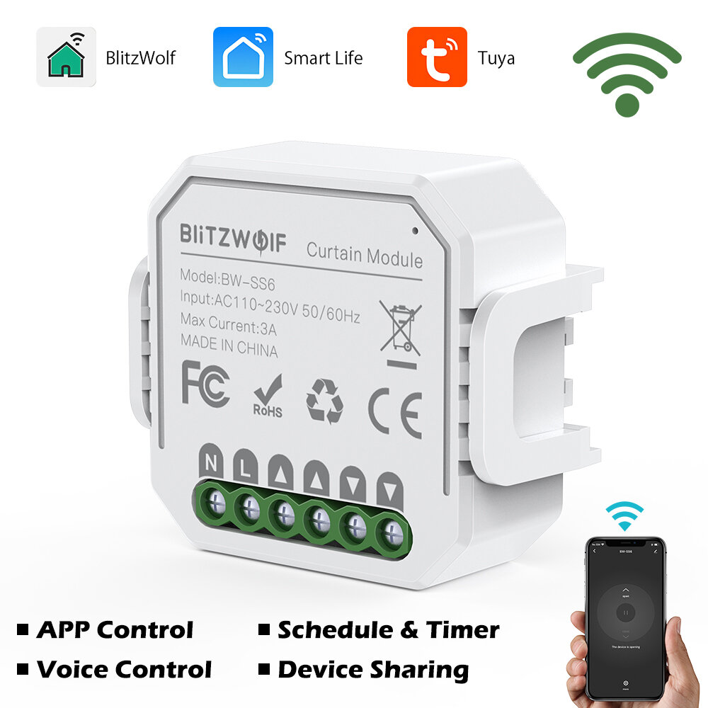 . Noter: Ce produit doit etre utilise avec des moteurs de rideaux, veuillez acheter separement. Caracteristiques: Modele BW-SS6 Saisir AC110~230V 50/60Hz Courant maximum 3A(Max) Alimentation de secours 0.5W Type sans fil 2.4G Wi-Fi Materiel ABS V0 Classement IP IP20 Temperature de fonctionnement -10?~45? Taille du produit 46*46*18mm Emballage inclus: 2 x Telecommande APP du module de rideau intelligent WIFI BlitzWolfe BW-SS6 2 x manuel d'utilisation