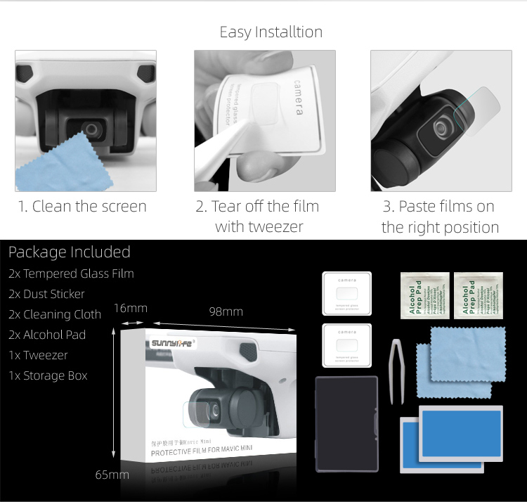 The tempered glass screen protector set is exclusively designed for DJI Mavic Mini camera Lens. Ultra thin tempered glass and full coverage design ensure effectively protect the camera lens. Protect your Mavic Mini camera screen and lens from daily scratches, dust, scrapes, fingerprints.Slim and light weight, shockproof. will not affect photos shooting in your daily life when wearing it.