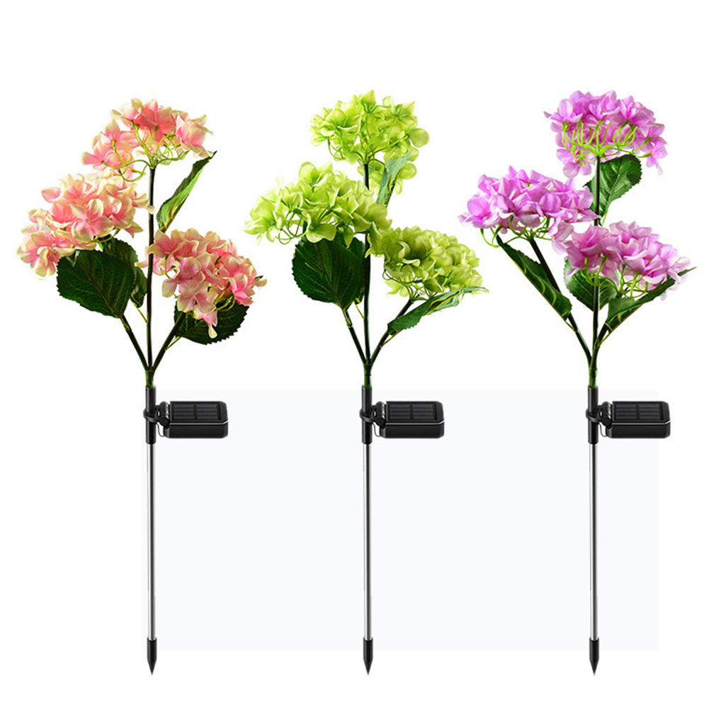2pcs Solar Hydrangea Flower Light 3 Heads Lawn Lamps with Stake for Outdoor Garden Patio Country Decoration Pink