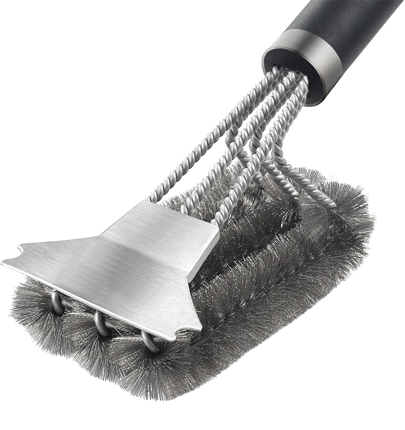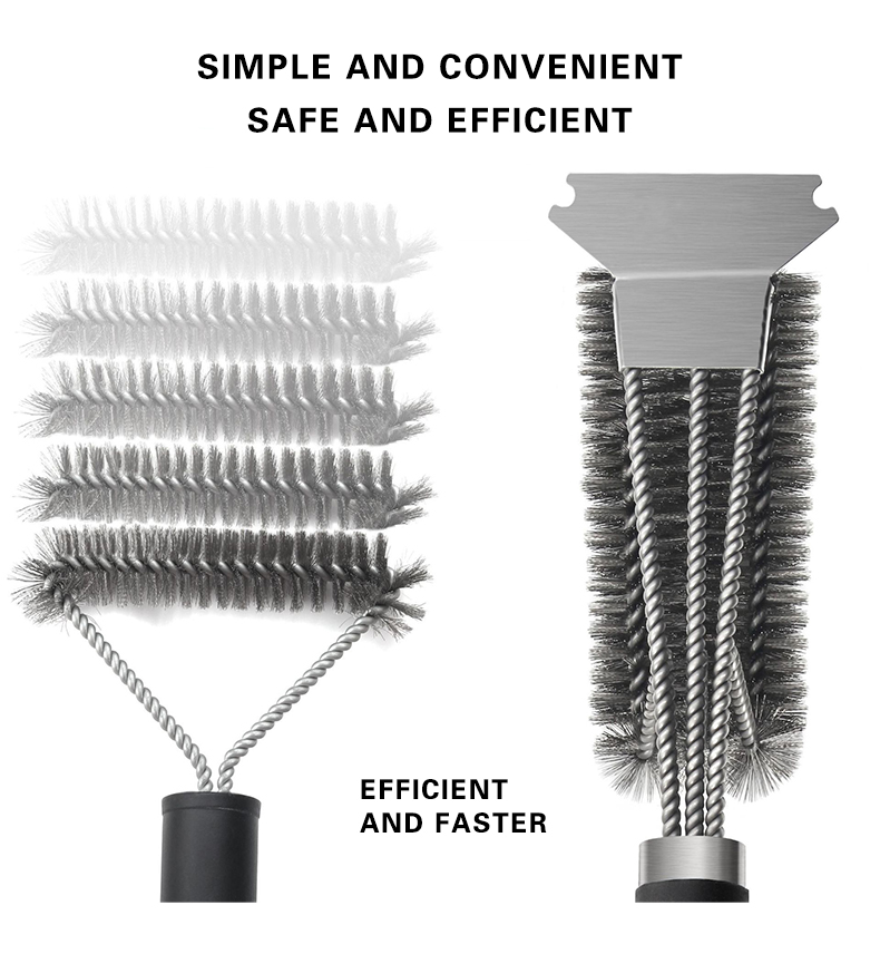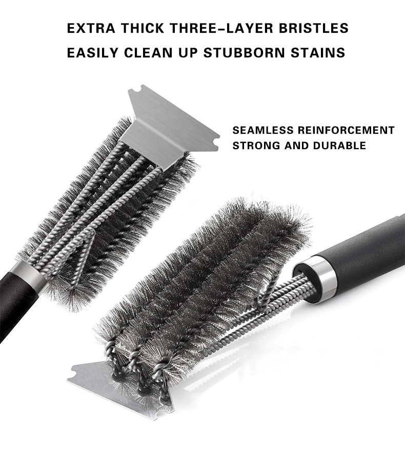 3 in 1 combination: cleaning quickly without effort. The brush is designed to wrap around your grill grates from 360°. 18' handle: safe from the heat coming off your grill Extra strength :Stainless steel brush held together by stainless steel piping wedged into a high grade solid plastic handle is of high standard and long lasting. Wide application: universal and can be used on any BBQ Grill, and can be washed by hand as well as dishwasher.
