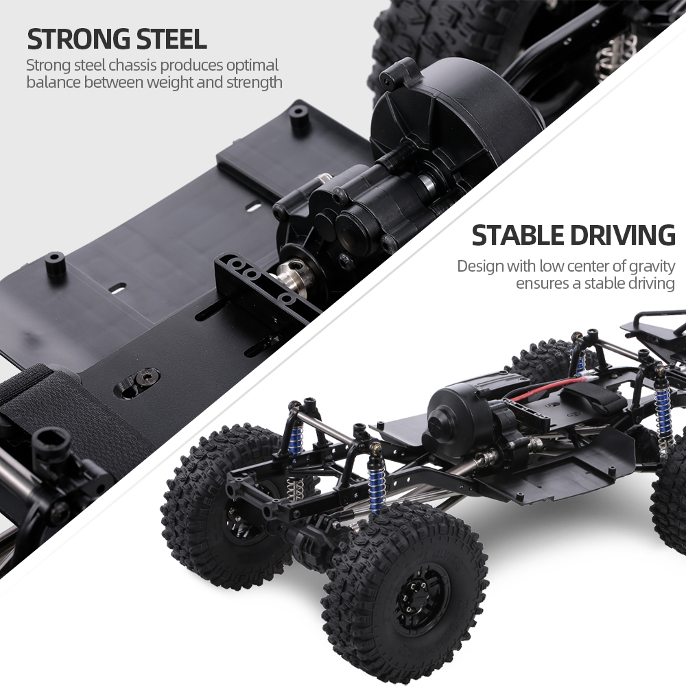 Two version are optional (A: with wheels B: without wheels). Steel frame rails adjustable wheelbase. Injection molded nylon axle housing,Steel internal gears and driveshaft, long service life. Lower the center of gravity forward, make RC Crawler more stable .