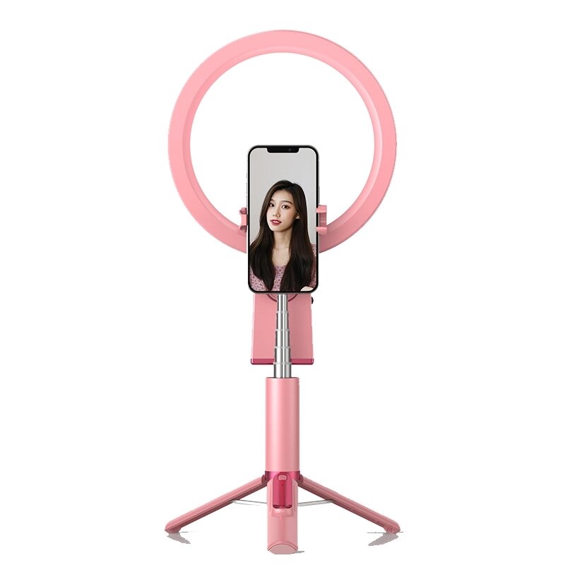 360 Rotation Live Video Shooting with LED Mirror Fill Light Extendable bluetooth Remote Selfie Stick – Pink