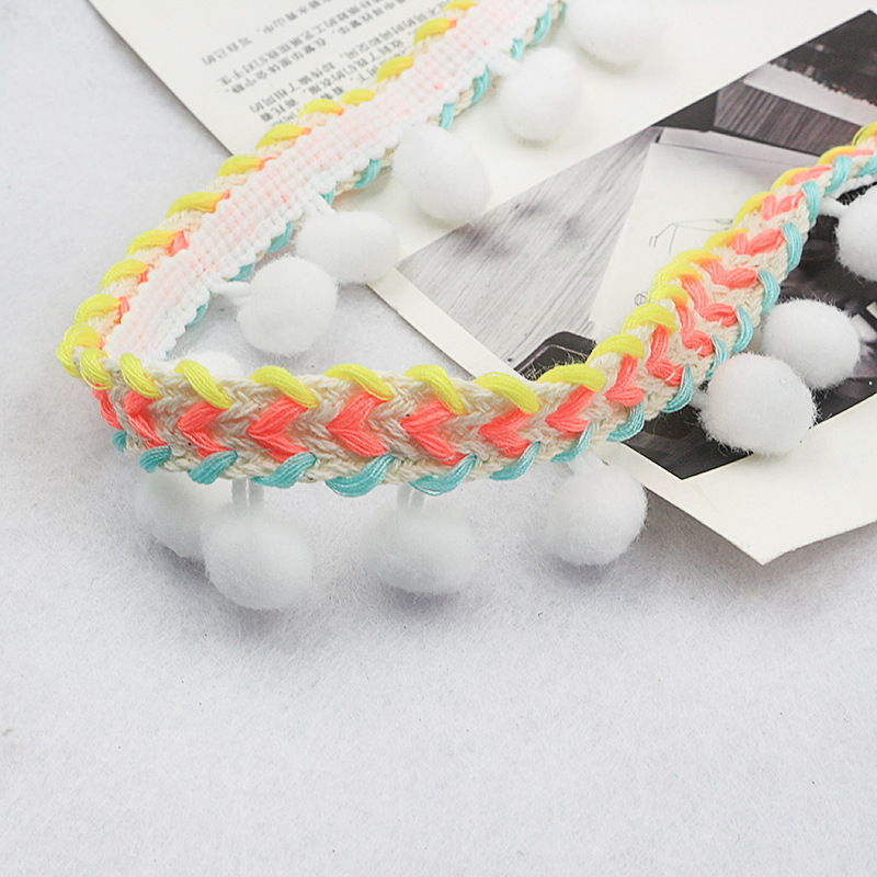 3Yard Ethnic Style Trim Ribbon 1.2CM Pom Ball Crafts Lace DIY Curtain Dress Sewing Colorful white_3 yards