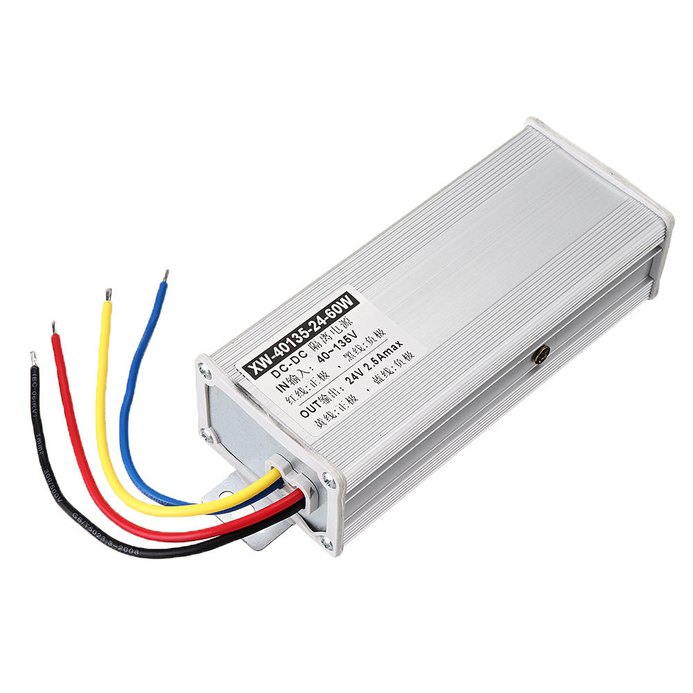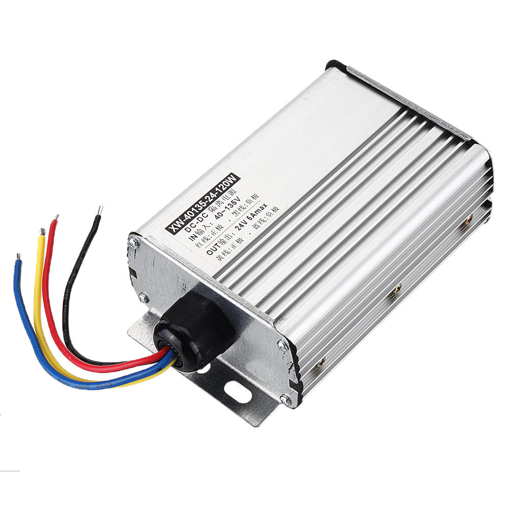 . Fonctionnalites: 1. Mince, petite taille, haute efficacite et facile e installer. 2. Protection multiple: protection contre les surintensites / protection contre les surtensions / protection contre les surchauffes et les courts-circuits. 3. Objet: alarmes de voiture, radio, interphone, moteurs electriques, audio, navigation, surveillance, ecran de voiture LED, climatisation, ventilateurs, energie solaire, DVD, lumieres LED, moteurs, pompes, equipements electriques industriels, etc. Specification: Materiel: aluminium Couleur: argent Taille de la coquille: 1A / 2.5A: 126x53x36mm (LxWxH) 5A: 120x86x45mm (LxWxH) Tension d'entree: DC 40-135V Tension de sortie: DC24V Courant de sortie: 1A / 2.5A / 5A Puissance: 24W (1A) / 60W (2.5A) 120W (5A) Efficacite de transformation: plus de 86% Ondulation: 40MV Protection Fuction: surintensite, surtension, surchauffe, protection contre les courts-circuits Temp de travail: -40 ? ~ + 85 Longueur du fil d'installation: 13 -14cm etanche: IP67 Couleur du fil d'entree: (+) rouge, (-) noir. Couleur du fil de sortie: (+) jaune, (-) noir. Note: S'il vous plaet rappelez-vous pour vous assurer que le ceblage soigneusement et correctement. Aucun ceblage n'inverse la protection de cet appareil. Emballage inclus: 1 x Convertisseur de puissance Buck etanche 40-135V e 24V CC 1A / 2.5A / 5A