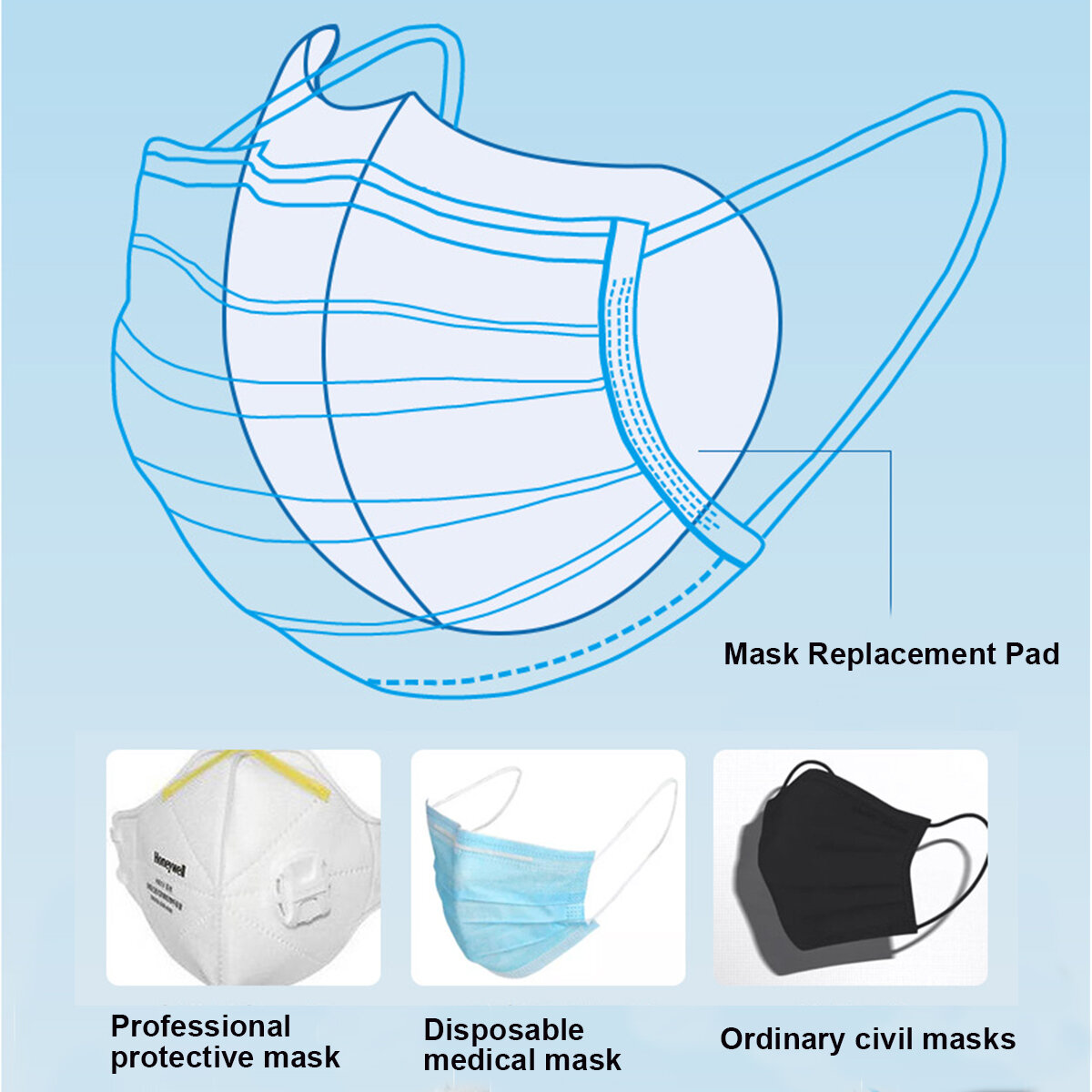 2. Trois couches plus un tissu non tisse doux, la protection e double couche est plus sere, adsorbe la poussiere et les odeurs pour proteger l'interieur du masque