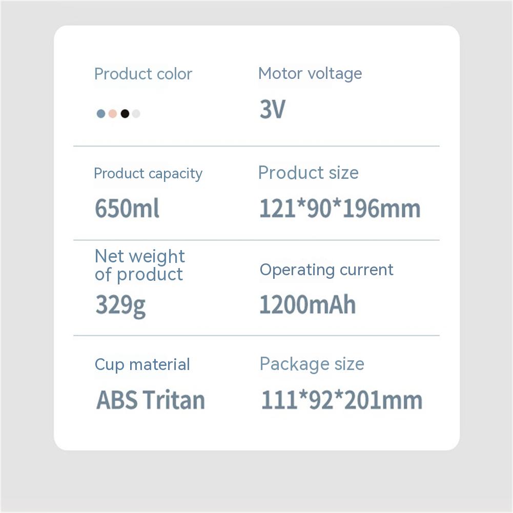 Product size: 121 x 90 x 196mm 7000rmp Powerful Power: High-speed motors drive strong vortex water flow, Can quickly stir water and powder mixture Farewell hand crank: High-energy, quick stir and enjoy delicious food Immediately 650ml large capacity: Sports energy supply station. Energy is not urgent, Status stays online Food grade Tritan material: The straight cup body can withstand the cold and heat of the station
