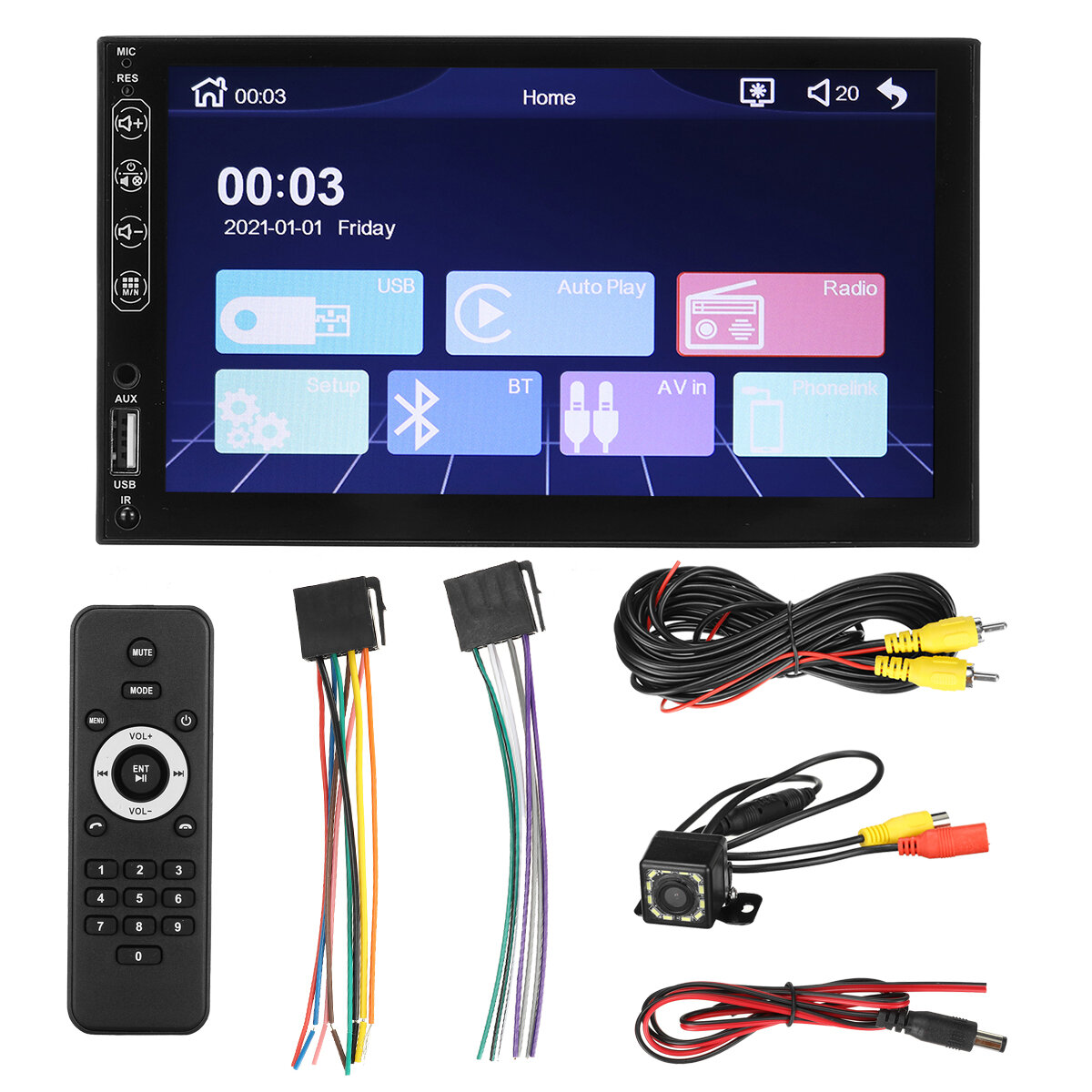 Description: 2 din carplay MP5 player head unit.7 inch TFT capacitive touch screen. 1080P high definition video format. Multicolor backlight button effect. Carplay functions for IOS phone. Wired Auto functions for Android phone. Wired Mirror link. AM,FM radio. Aux-in audio input. USB,TF card input. bluetooth 5.0 handsfree. Support audio format: FLAC,APE,WAV,MP3,WMA. Support video format: AVI,MP4,MKV,RM,RMVB,3GP. Support RCA audio output. Support reverse camera input. Supports steering wheel control functions. Support video input and video output. Languages: English , Chinese , Arabic , Turkish , Russian , Hebrew , Thai , German , French , Portuguese , Spanish , Italian , Indonesian