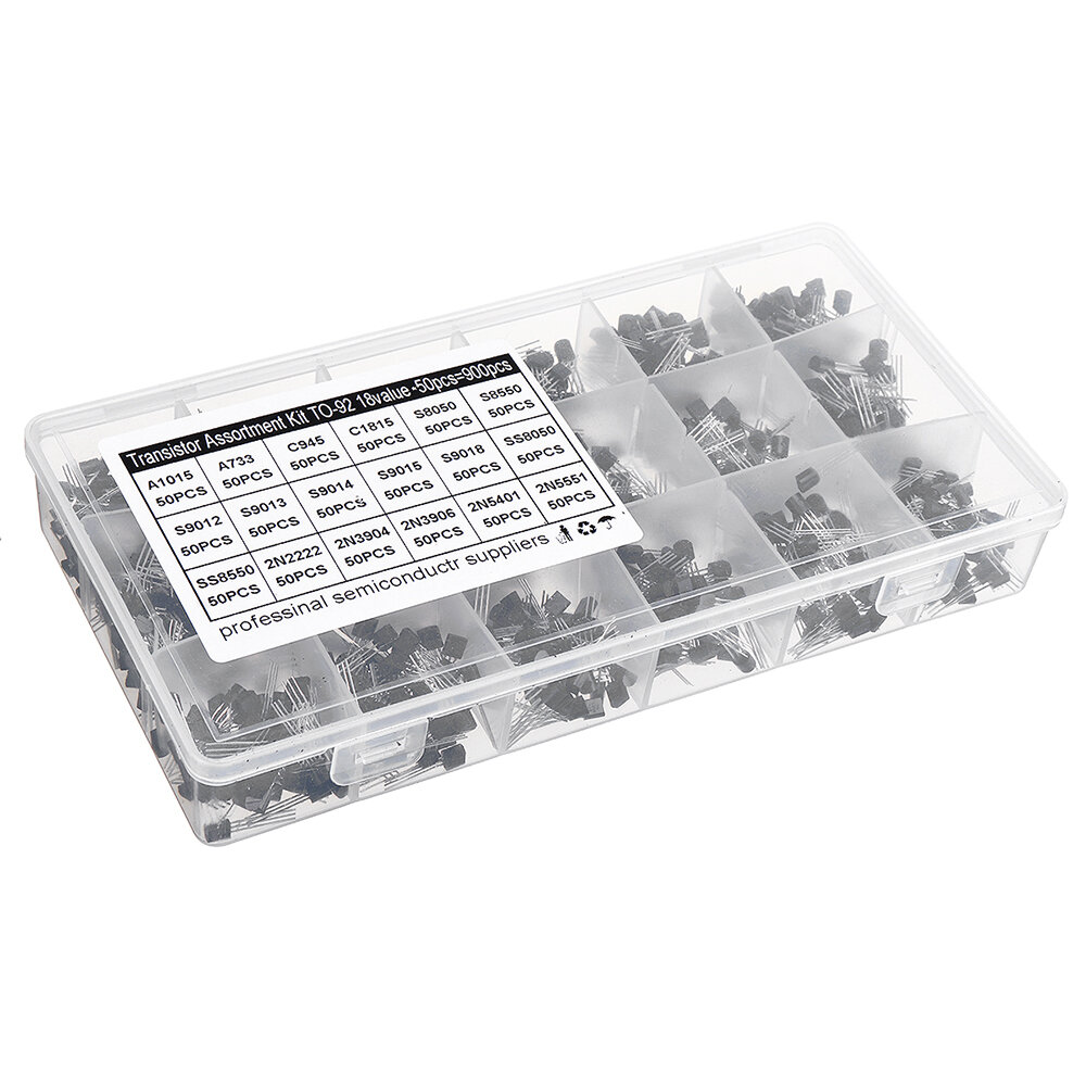 900Pcs 18Valeur NPN / PNP Transistor Set 2N2222 2N3904 2N3906 2N5401 2N5551 A1015 A733 C1815 C945 SS8050 SS8550 S8050 S8550 S9012 S9013 S9014 S9015 S9018