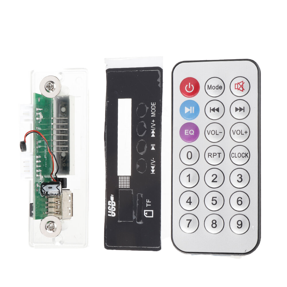 . Fonctionnalites: 1: Taille: 83 mm (L) e 28 mm (H) e 30 mm (profondeur interieure) pas du trou central: 76 mm 2: jouer avec tfcard ou disque flash USB 3: alimentation 9v-12v 4: La carte de decodage est equipee d'une lampe e retroeclairage bleu LED, ce qui peut augmenter l'atmosphere musicale lors de la lecture. 5: fonction FM 87,5-108,0 mhz. 6: fonction d'entree Aux. 7: prise en charge de la fonction d'appel Bluetooth mains libres. 8: avance / retour rapide 9: eteindre le volume de la memoire 10: mise sous tension du mode Bluetooth par defaut 11. La carte de decodage prend en charge: lecture en boucle complete, lecture en boucle unique Instructions: Operation de lecture MP3: Inserez le disque U ou la carte SD avec les chansons MP3 copiees e l'etat de mise sous tension, et la machine reconnaetra et lira automatiquement Lors de la lecture de MP3, les fonctions sont les suivantes: "Precedent" appuyez brievement pour lire la chanson precedente, appuyez longuement pour diminuer le volume; "Chanson suivante" appuyez brievement pour lire la chanson suivante, appuyez longuement sur l'augmentation du volume; Selection du mode machine "Mode": cycle en FM, aux et MP3; eLecture / pausee appuyez pour mettre en pause la chanson en cours de lecture pour la premiere fois et appuyez e nouveau pour restaurer l'etat de lecture. Touche RPT de la telecommande: appuyez sur cette touche pour une boucle simple ou complete. L'affichage "un" est une boucle unique. Tout est en boucle Touche EQ: appuyez sur cette touche pour obtenir un effet sonore egal: il y a respectivement six effets sonores. Les fonctions cles du statut FM sont les suivantes: "Precedente" pression courte de la station de recherche haute e basse, reduction du volume de pression longue; "Chanson suivante" pression courte de la station de recherche faible e elevee, augmentation du volume de la pression longue; Selection du mode de fonctionnement de la machine "Mode": cycle d'entree USB / SD / Aux / FM / bleu; "Lecture / pause" appuyez brievement pour passer e la station memorisee suivante, appuyez longuement pendant 3 secondes pour effectuer une recherche automatique et memoriser la station Fonctionnement de la fonction Aux: Appuyez sur la touche emodee de la carte suivante pour passer la machine e l'etat eauxe. e ce stade, les autres touches de fonction ne sont pas valides et seule la touche emodee est valide. La source sonore est entree par l'interface 3P sur la carte et le volume est contrele par l'equipement de source sonore externe. Partie d'affichage e LED: Statut MP3: affichez si les chansons en cours de lecture proviennent du disque U ou de la carte SD, et affichez la progression du temps de lecture; Lors du reglage du volume: affichez le niveau de volume, qui est le niveau 16 Aux sta tus: affiche l'etat de travail actuel; FM sta tus: affiche la frequence actuelle de la station. Fonctionnement Bluetooth Appuyez sur "mode" sur le panneau pour passer la machine e l'etat "bleu". e ce moment, les trois lumieres LED sont en etat de clignotement continu. Allumez le peripherique audio avec la fonction Bluetooth, recherchez eyxy-cy04-bte et connectez-le. Les lumieres LED arretent de clignoter en continu et entrent dans l'etat de lecture normal. Le volume peut etre contrele par l'appareil source sonore externe, ou ajuste en appuyant longuement sur "precedent" et "suivant"; Appuyez brievement sur "lecture / pause" pour l'appel entrant et appuyez longuement pour le rejet. Appuyez brievement sur "play / pause" lors de l'appel ou pendant un appel pour raccrocher. L'operation sur la telecommande est la touche electure / pausee de la telecommande Instructions de ceblage: 1. Siege rouge 2p: GND est connecte au pele negatif de l'alimentation, + 12V est connecte au pele positif du DC dc7-12v; 2. Siege blanc 3P: outr est la sortie du canal audio droit, agnd est le fil de masse audio, outl est la sortie du canal audio gauche; 3. Siege blanc 3P: Lin est l'entree du canal gauche de la voix externe, agnd est la ligne de masse de la voix externe et Rin est l'entree du canal droit de la voix externe; 4. Le coussinet blanc fourmi est l'emplacement pour souder l'antenne radio. L'antenne radio peut etre un fil de cuivre ou une antenne tige de traction d'une longueur superieure e 1 m, et l'effet radio depend de l'environnement geographique. Emballage inclus: 1 x carte decodeur audio sans perte Bluetooth USB