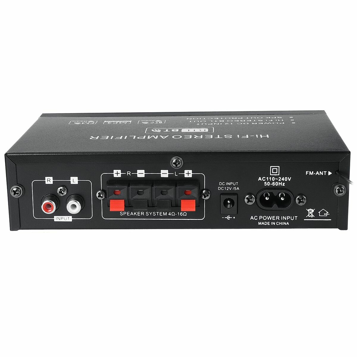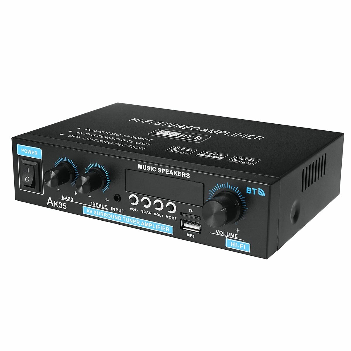 . Caracteristiques: Modele: AK35 Materiel: alliage d'aluminium La couleur noire Dimension: 20 x 17 x 5,5 cm / 7,9 x 6,7 x 2,2 pouces Entree CC: DC 12V Entree AC: AC 110V-240V Rapport signal / bruit: 85 dB Taux de distorsion: 0,05% Impedance du haut-parleur: 4-8O Traits: Cet amplificateur de puissance stereo convient e la maison, e l'audio sur scene et e d'autres scenes USB, lecteur SD, plug and play, vous pouvez jouer Design intime, chansons preferees, singles, specialement coneus pour les amis qui aiment la musique Technologie haute performance, faible bruit et faible courant continu, tout comme une scene de concert Avec la telecommande, plus pratique Le volume principal, le reglage des aigus et le reglage des graves sont tous regles par des composants analogiques pour mettre e niveau la mini-table de mixage, vous permettant de jouer le monde de la musique et de vous donner de vrais effets sonores HIFI Bluetooth sans fil, smartphones, tablettes et autres appareils Bluetooth faciles e connecter, interface USB, c'est-e-dire diffuser et utiliser, et profiter d'une musique de haute qualite Re s: Mesure manuelle, veuillez permettre une erreur de 1 e 3 mm, merci. En raison de la difference entre les differents moniteurs, l'image peut ne pas refleter la couleur reelle de l'article. Nous garantissons que le style est le meme que celui indique sur l'image. Emballage inclus: 1 x amplificateur stereo 1 x telecommande 1 x ceble d'alimentation 1 x manuel de l'utilisateur