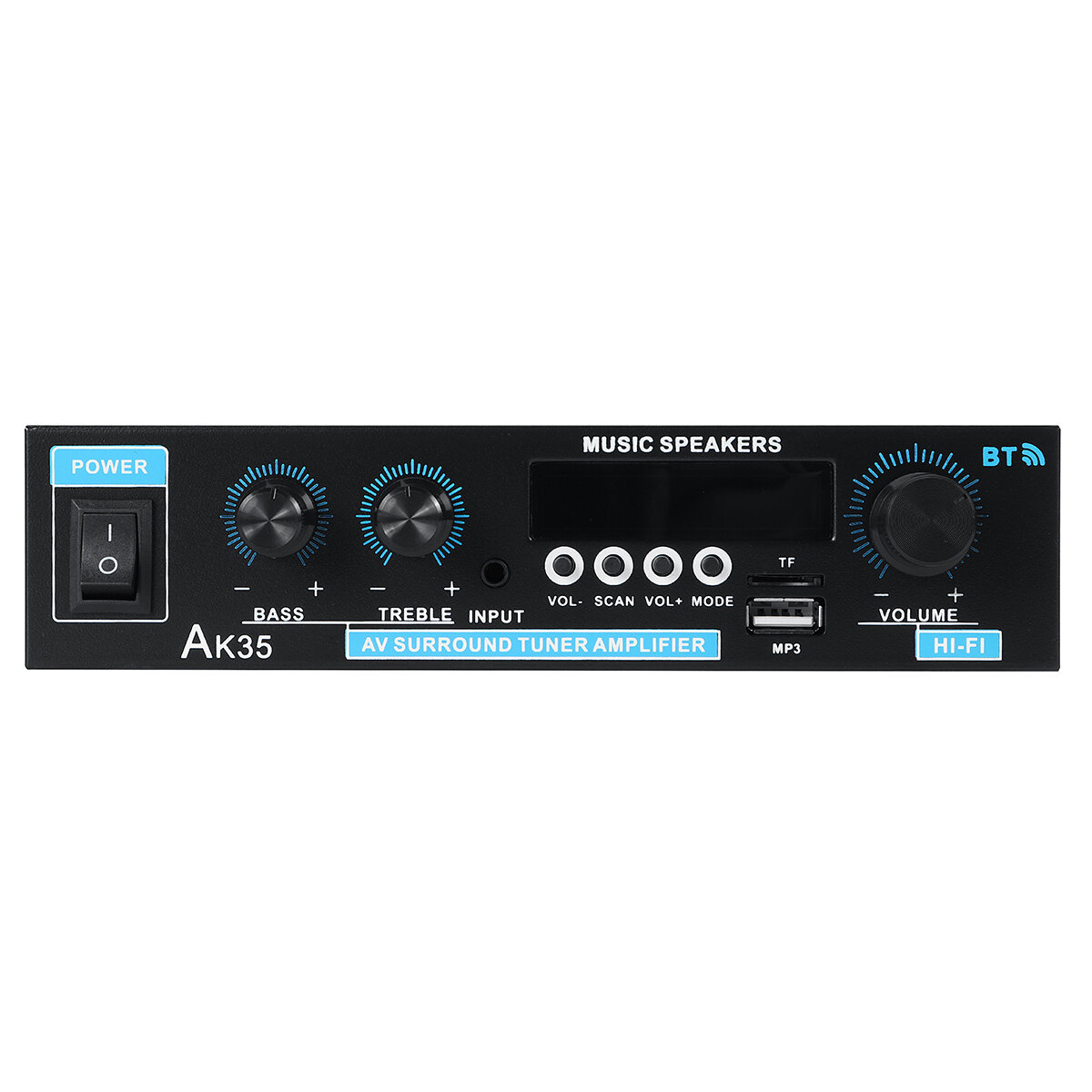 ?Features:This stereo power amplifier is suitable for home, stage audio and other scenesUSB, SD player, plug and play, you can playIntimate design, favorite songs, singles, specially designed for friends who like musicHigh-performance technology, low noise and low DC, just like a concert sceneWith the remote control, more convenientThe main volume, treble adjustment and bass adjustment are all adjusted by analog components to upgrade the mini mixer, allowing you to play the world of music and give you real HIFI sound effectsWireless Bluetooth, easy to connect smartphones, tablets and other Bluetooth devices, USB interface, that is, broadcast and use, and enjoy high-quality musicModel: AK35Material: Aluminum AlloyColor: BlackDimension:20 x 17 x 5.5cm/7.9 x 6.7 x 2.2inchDC input: DC 12VAC input: AC 110V-240VSignal to noise ratio: 85dBDistortion rate: 0.05%Speaker impedance: 4-8?