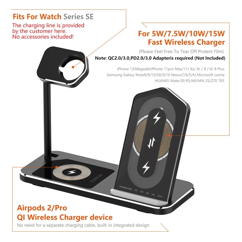 . Parametre de produit : AODUKE Compatible Pour iWatch 1/2/3/4/5/6/SE Pour iPhone 8-12 Pour Airpod 2/3 Pro Materiel Alliage d'aluminium Pouvoir 5W/ 7.5W/ 10W/15W/ 18W Contribution Prise en charge QC/PD, 5V-3A/9V-2A Production 5V-3A/9V-2A Poids net Environ 480g Taille Environ 85*75*132mm Couleur Noir Emballage inclus Station de charge rapide 1 * 3-EN-1 1 * ceble de chargement TYpe-C vers USB 1 * manuel d'utilisation