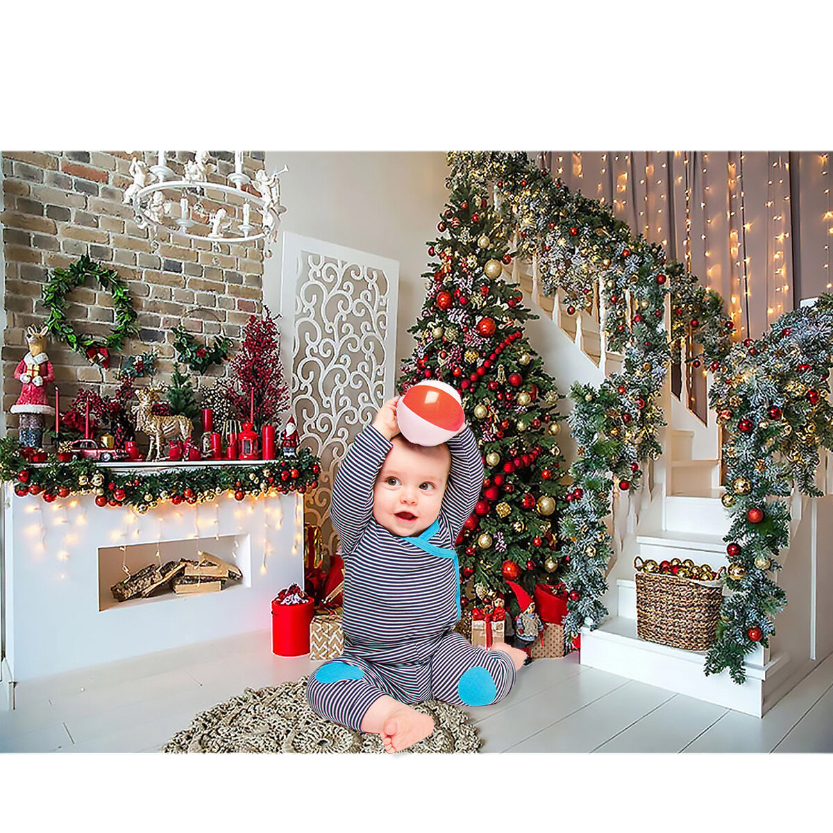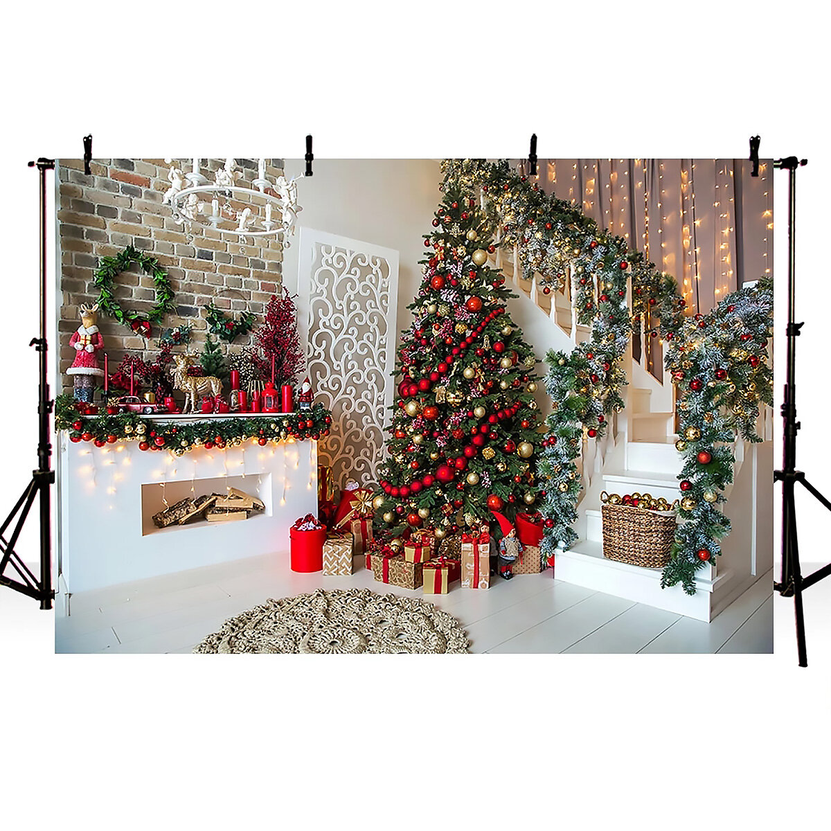 Arbre de noel escaliers photographie decors bois plancher cheminee fond tissu pour Photo Studio toile de fond – 2,1 x 1,5 m