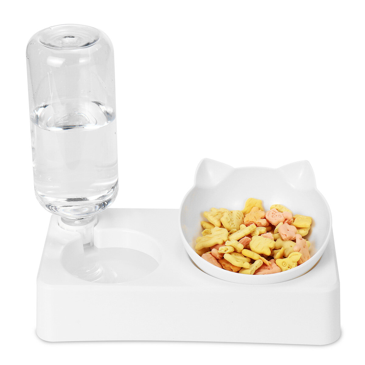 ?- It is designed with a tilt of 15° to increase the base to reduce the cervical vertebra compression caused by excessive lowering of the head           when the pet eats.- PC environmental protection material, fall resistant, safe and easy to clean.- Double bowl design, healthy diet: a set of tableware can provide water and food for dogs and cats at the same time.- Separation design: humanized separation design can clean the components one by one after disassembly.?