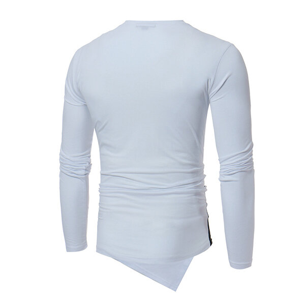 Autumn Concise Bumped Irregular Hem T-shirt Men’s Casual Stiching Color Buttons Long Sleeve Tops – S White