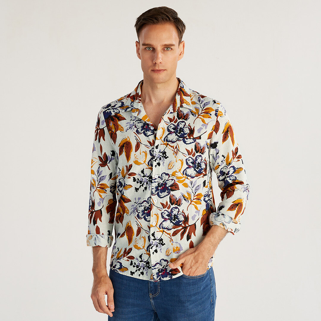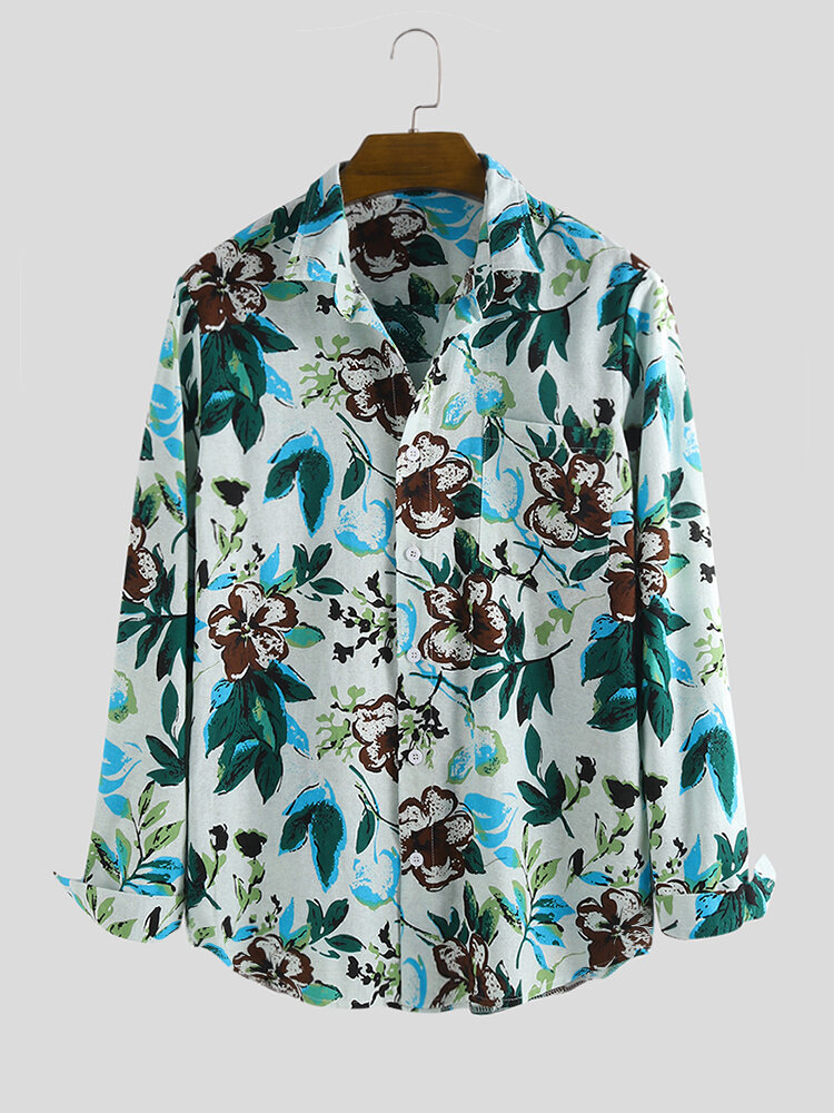 Autumn Mens Leaves Printing Long Sleeve Casual Shirts – M Blue