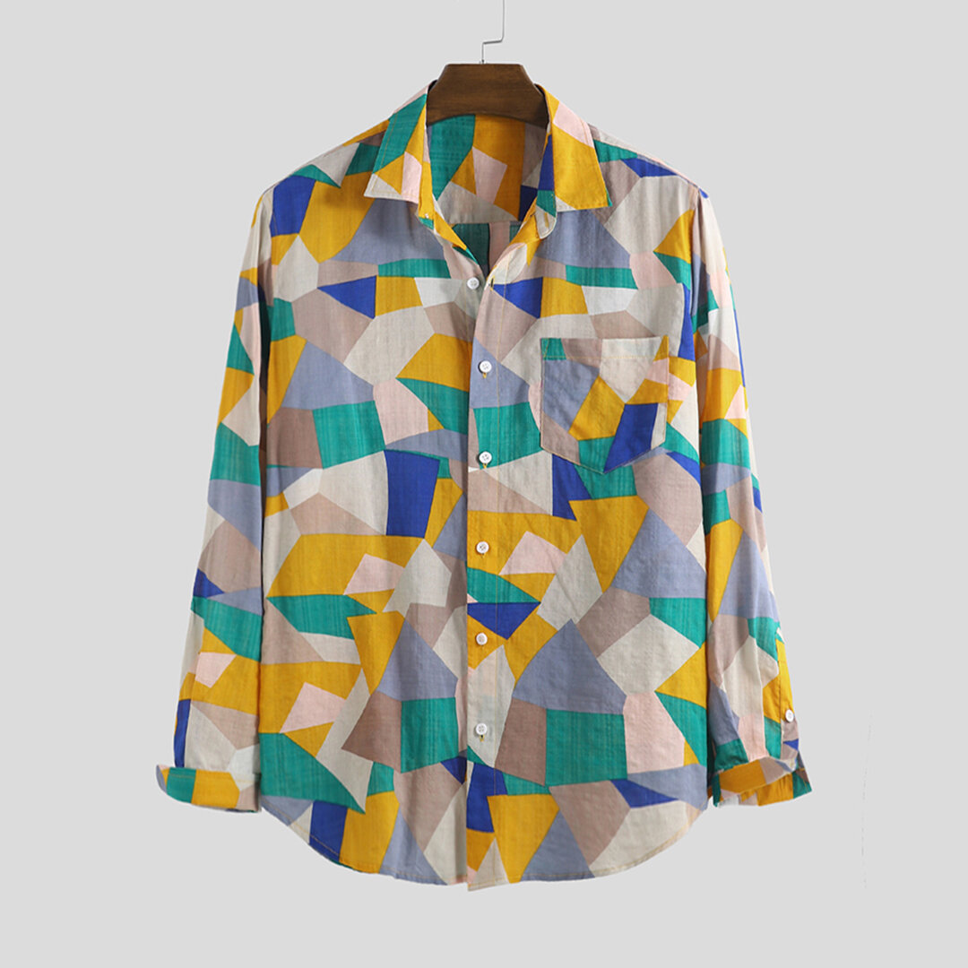 Autumn Multi Color Block Printing Long Sleeve Casual Shirts – M Yellow