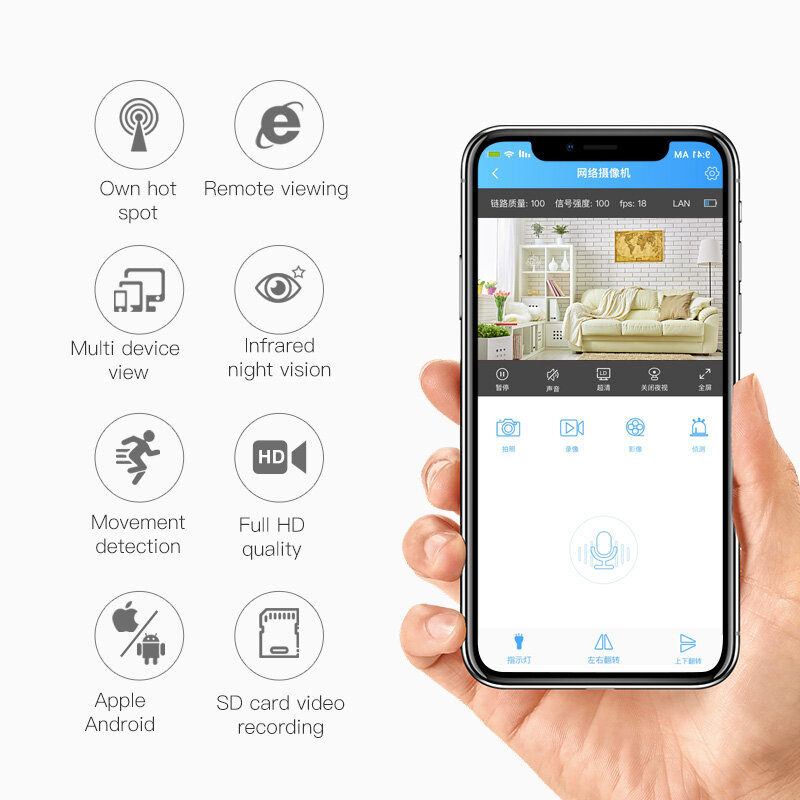 Alarme de detection de capteur de mouvement et enregistrement?Cette camera sans fil enverra une notification push avec des images e votre telephone une fois qu'un mouvement est detecte. Vous pouvez egalement definir un enregistrement de detection de capteur de mouvement sur une carte Micro SD, cela peut economiser la capacite de la carte memoire.