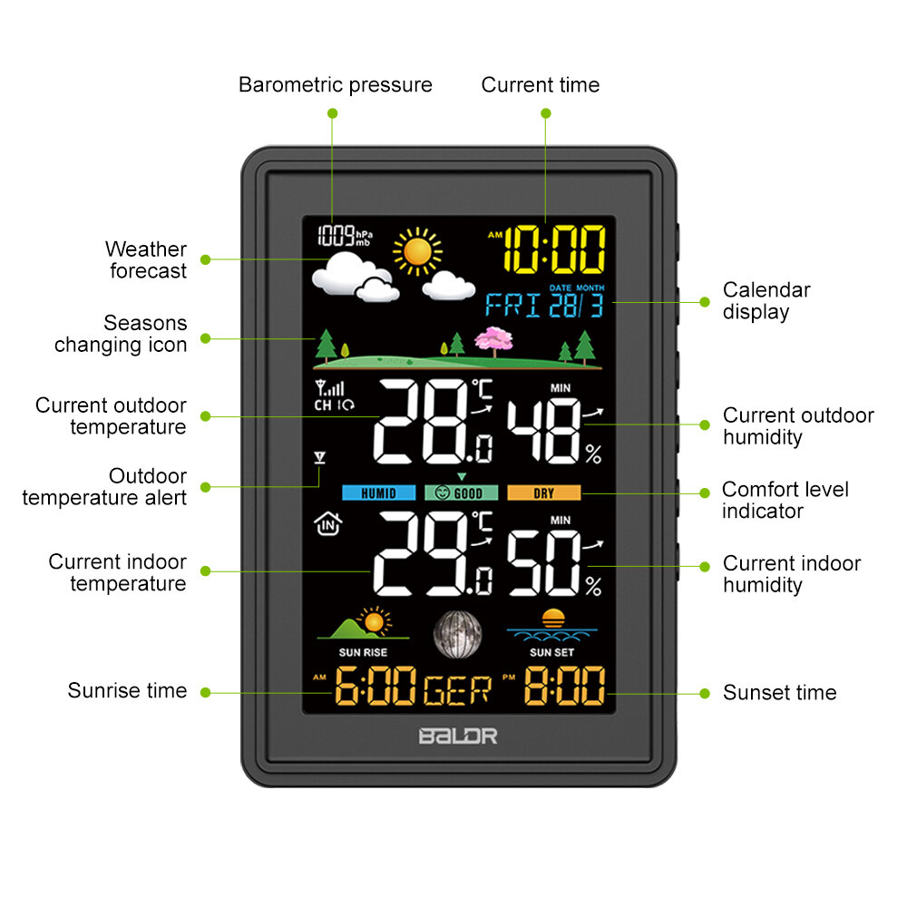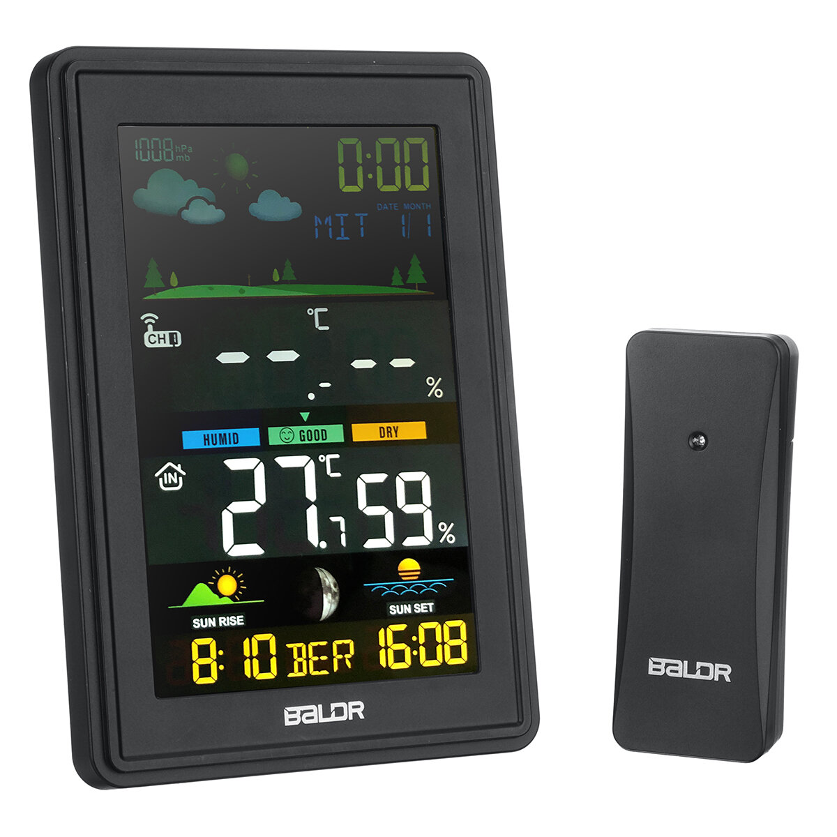 Bakeey LCD ecran Station meteo sans fil thermohygrometre previsions meteorologiques reveil calendrier perpetuel Phase de lune – Noir
