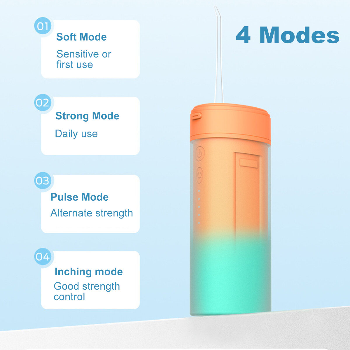 Features:-Small and beautiful, easy to carry.-IPX6 waterproof, can wash the whole machine safely.-Detachable telescopic water tank, large capacity 160ml,easy to clean.-Double key design to avoid misinjection, select the gear, then turn on the machine, and aim at the teeth, crevices or gums to ensure that the water flow is perpendicular to the washing part.-Automatic power off without water to avoid machine burn out. Specifications?MaterialABSColorOrange gradient /Pink gradientWorking mode4 Modes(Soft, Strong, Pulse, Inching mode)Water tank capacity160mlWaterproof gradeIPX6Nozzle diameter0.8mmRated power6.5WRated current1.35ACharging voltageDC5VBattery capacity500mAhCharging modeUSB type-C CableCharging timeAbout 3 hours Package included?1 x Oral Irrigator1 x Use Manual1 x Box2 x Nozzles