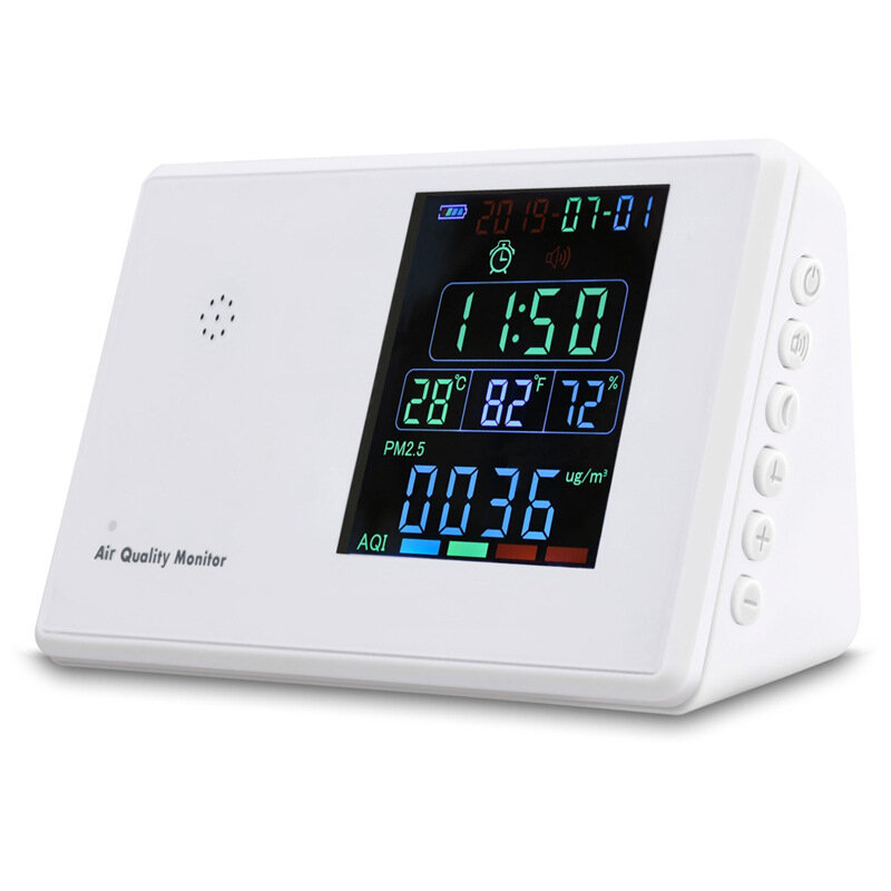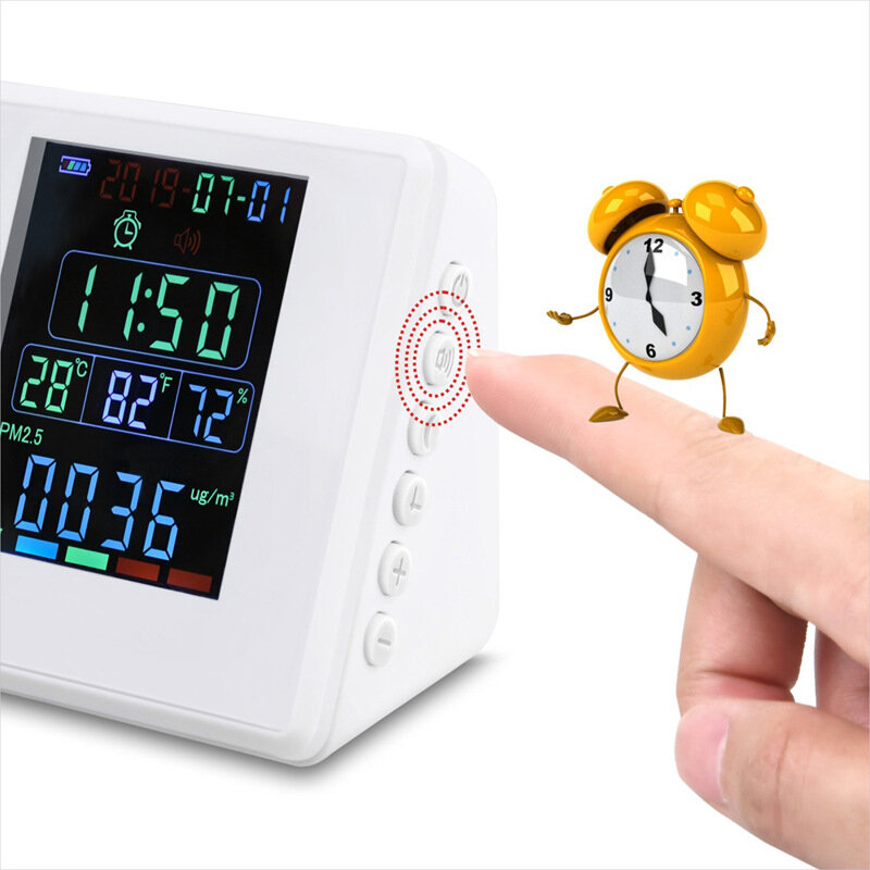 2.Il est multifonctionnel, qui peut detecter HCHO / TVOC / CO2 / PM2.5 / temperature / humidite, peut egalement definir et afficher l'heure, le reveil et le calendrier.