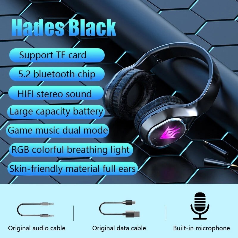 Bakeey T2 bluetooth 5.2 sans fil jeu/mode musique casque de jeu pliable lumieres magiques rvb casques HiFi stereo 3D avec micro – Noir