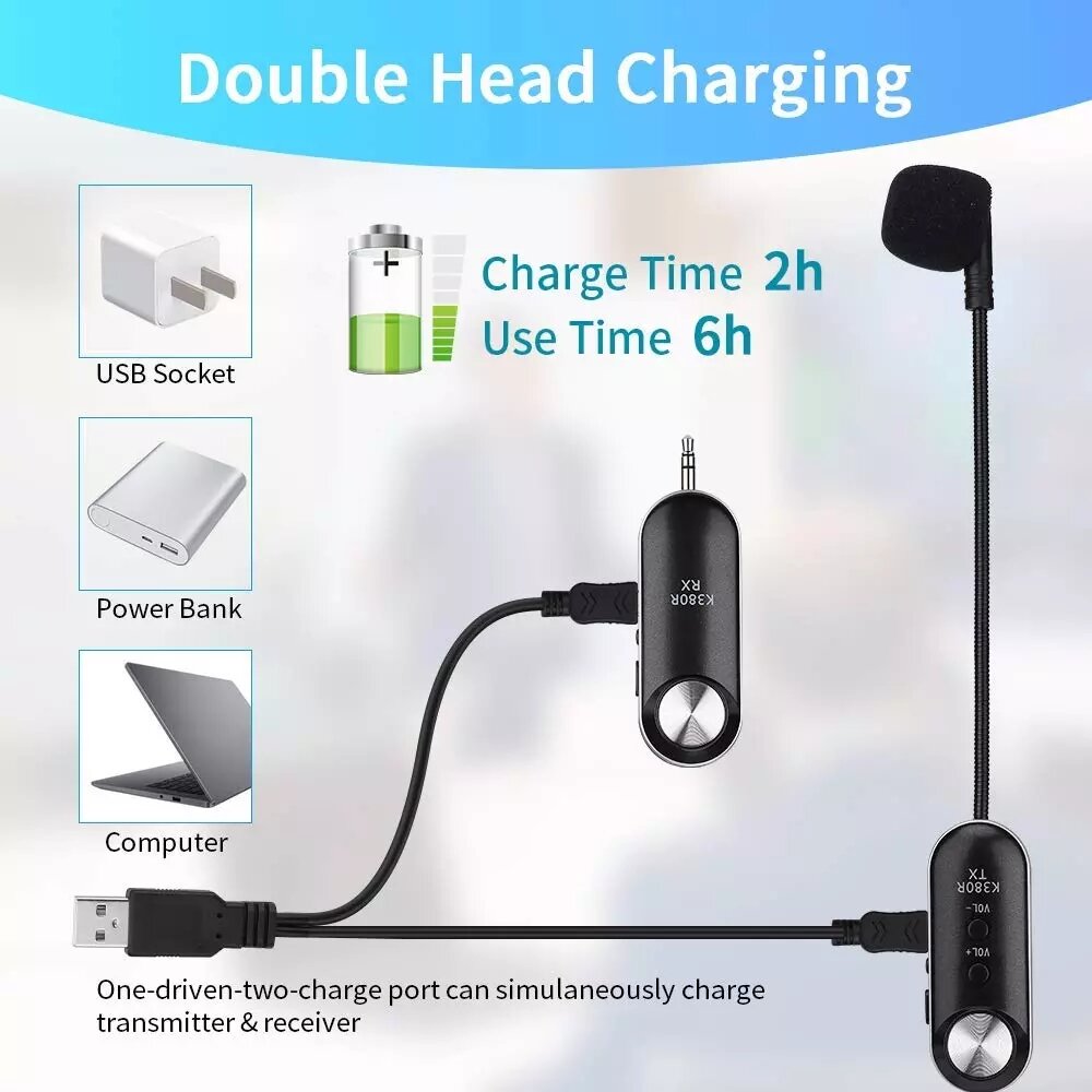 . Specification: Temps de travail : 6 heures Temps de charge : 2,5 heures Materiel: alliage d'aluminium et ABS Portee de transmission : jusqu'e 160ft(50M) emetteur et recepteur Batteries lithium-ion rechargeables 400 mAh integrees Applications: Convient pour l'enseignement, les cours de fitness, les discours publics, les entraeneurs, les artistes de scene, les conversations professionnelles, les conferences, les podcasts Web, les reunions, les enregistrements YouTube, les enregistrements en exterieur, l'instructeur Yoga, les podcasts de jeux de balle, etc. Caracteristiques: -Adopter la technologie de transmission sans fil UHF (ultra haute frequence) avancee, mise e niveau de la distance de transmission jusqu'e 160 pieds (50 m). -2 Prises en charge de la prise audio : Prise en charge des prises jack 1/8 "(3,5 mm) et 1/4" (6,35 mm), convient e presque tous les haut-parleurs, barres de son, amplificateur vocal, appareil photo, systeme audio, etc. ) -Fonction d'economie d'energie (eteindre automatiquement si 5 minutes sans utilisation) -Le double ceble Micro USB peut charger e la fois l'emetteur et le recepteur sans fil en meme temps. -Plug and play, appuyez longuement sur la touche d'alimentation du recepteur et du casque pour demarrer la machine Liste d'emballage : 1 * micro 1 * recepteur 1 * ligne de charge USB 1 * joint D3.5 e D6.5 1 * ligne de connexion D3.5 1 * Manuel