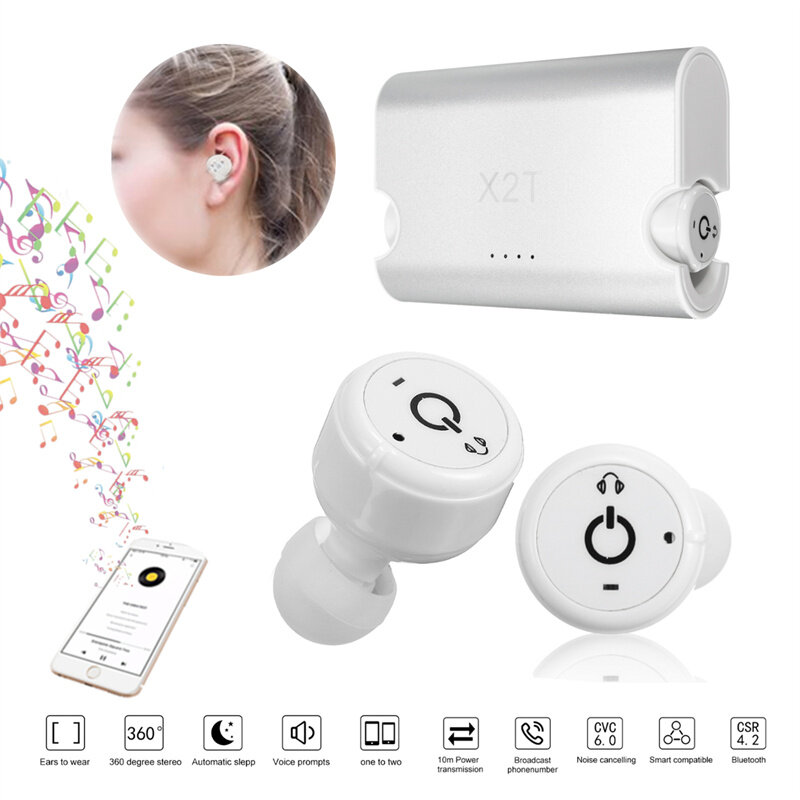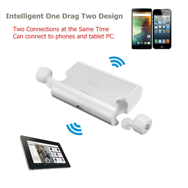 . Caracteristiques: -Stereo doublet sans fil TWS, HIFI son super clair 2.Bluetooth version 4.2, frequence 2,4 GHz, ultra faible consommation d'energie. 3.Les casques d'ecoute e feuille et e oreille droite ont une fonction de casque Bluetooth complete, peuvent lire des chansons, des appels telephoniques, peuvent etre utilises seuls, peuvent etre utilises par paires. -Adopte une coque en acier antideflagrant et des piles au lithium rechargeables, grande capacite 85 MAH, puis-je appeler pour 5-6 heures binaurales. -Technologie Bluetooth de pointe, cercle interieur de 30 metres sans messages texte, ligne circulaire exterieure de 10 metres. (sans barriere) -Construit dans la fonction d'annulation de bruit intelligente CVC6.0, appel clair -Support 1 drag 2, vous pouvez egalement connecter les deux appareils. -Livre avec la base de chargement en alliage d'aluminium de haute qualite, la batterie au lithium polymere integree, peut remplir l'electricite pour l'ecouteur 10 fois. Caracteristiques: 1.Modele: X2T 2.version Bluetooth: A64110 V4.2 3. Temps de lecture : oreille unique 10H, binaurale 5H 4.Temps de veille : oreille unique 200H, binaurale 100H 5. Capacite de la batterie : 85 mAh * 2 6. Capacite de la boete de chargement : 1500 mAh 7. Temps de charge : 1H 8.Transmission : 10 m 9.Couleur:Argent 10.Taille du produit:18.5*27mm 11.Taille de base de charge: 81*56*23mm Le forfait comprend: 1 paire de casques bluetooth TWS 1 support de charge 1 ceble USB 6 pcs ecouteurs
