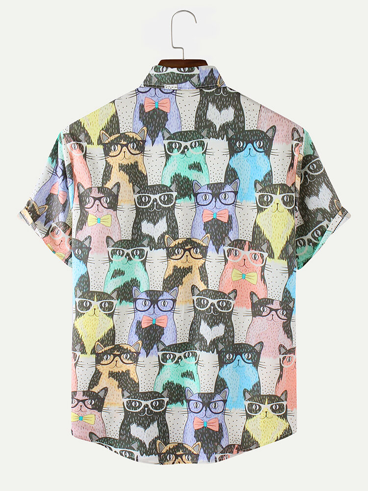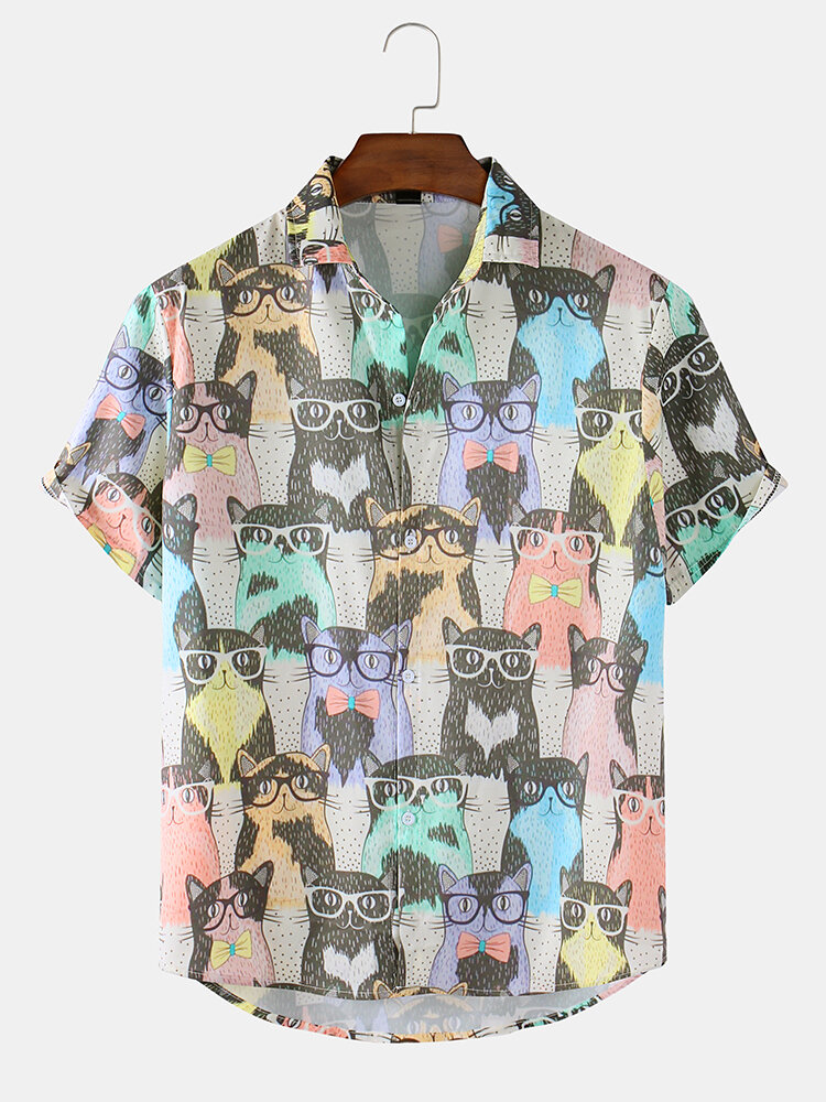 Banggood Desiged Mens Funny Colorful Glass Cat Cartoon Print Short Sleeve Casual Shirts – Colorful 2XL