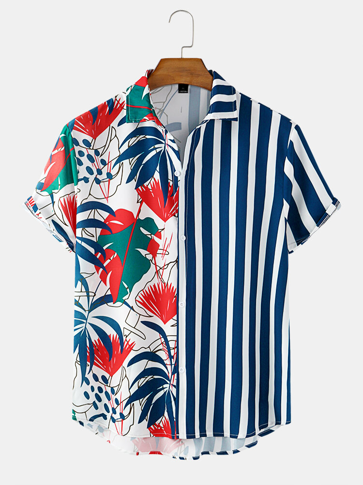 Banggood Design Spliced Tropical Leaf Colorful Stripe Mixed Print Short Sleeve Casual Holiday Shirts – Blue S