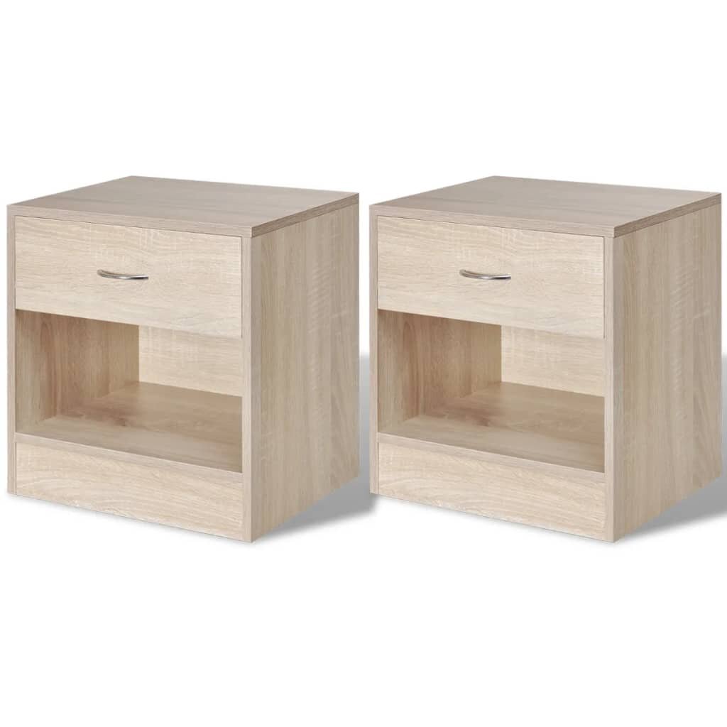 Deze 2 nachtkastjes hebben ieder 1 lade en hebben een eenvoudig maar stijlvol ontwerp. Ze kunnen gebruikt worden als nachtkastjes of als accenttafeltjes. De lade biedt voldoende ruimte om kleine spulletjes geordend en binnen handbereik te houden. Het schap onder de lade biedt extra opslagruimte. De kastjes zijn gemaakt van hoogwaardig spaanplaat en MDF waardoor ze duurzaam en eenvoudig schoon te houden zijn. De levering bevat 2 nachtkastjes en montageaccessoires. Montage is erg eenvoudig.