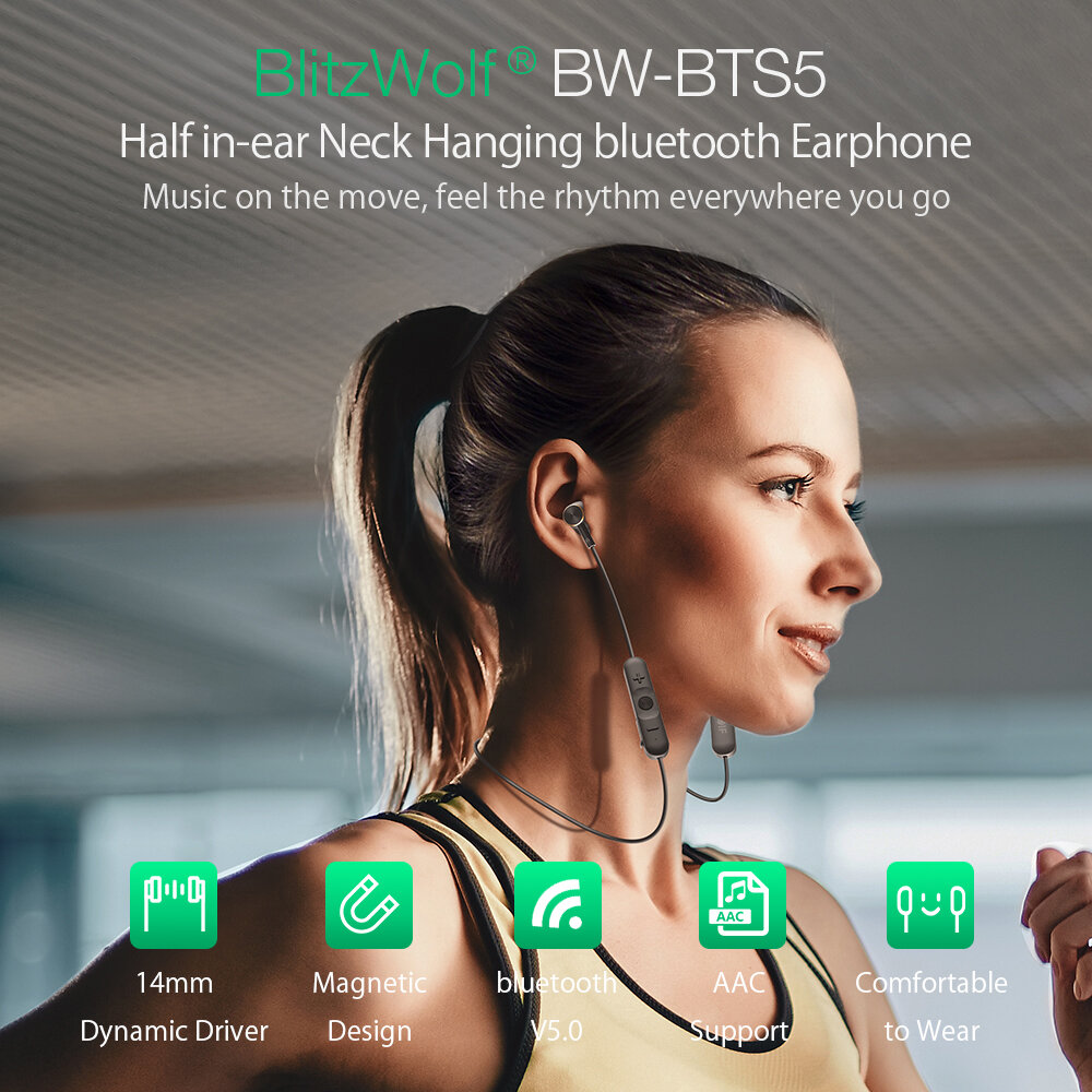 BlitzWolfe BW-BTS5 ecouteurs sans fil Bluetooth 5.0 ecouteurs HiFi Stereo AAC Magnetique Semi-intra-auriculaire Sport Neckband Casque Casque avec micro – Noir