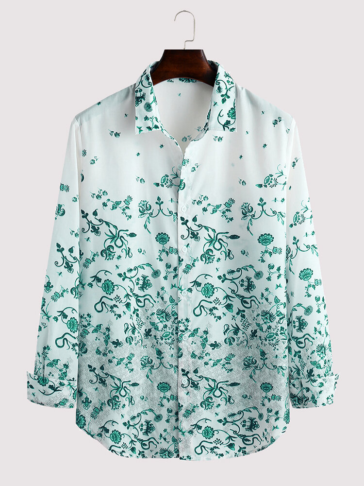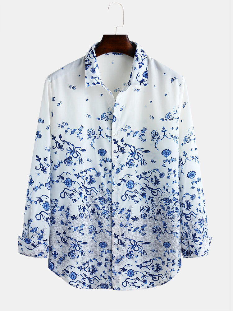 Blue And White Porcelain Floral Print Long Sleeve Casual Shirts – Black M
