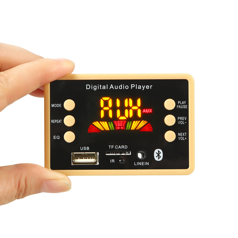 Features:  1. Bluetooth hands-free calling and Bluetooth support external touch keys2. Support folder choose to play (remote control operation) - easy to choose to play different music category card / U disk in the music category to put a different folder, DJ music / background music / songs, long press on or in playback mode next song, you can select the folder to play (at the same time there will be F001, F002 on the screen) 3. Support USB / TF / Bluetooth / FM / AUX switch automatically. Tips and conversion to cable (signal sound or voice in English optional) 4. Support MP3 / WMA / WAV format music. MP3 songs 32-320kbps, WAV / WMA is: 1411kbps or less 5. Support USB / card switch, the song, the next song, volume control, EQ, play / paose, stop, mute, shutdown, direct election songs. 6. Support Bluetooth Bluetoot one, the next song, volume control, play / paose, mute. 7. Support the power and memory function: memory off before the song played and the volume can be memorized to the current point. Breakpoint memory (in playback mode withdrawn U disk or TF card the first time in about three seconds off the power again will the breakpoint memory play). Package Included: 1 x bluetooth 5.0 Car MP3 Audio Decoder Board1x Remote Controller