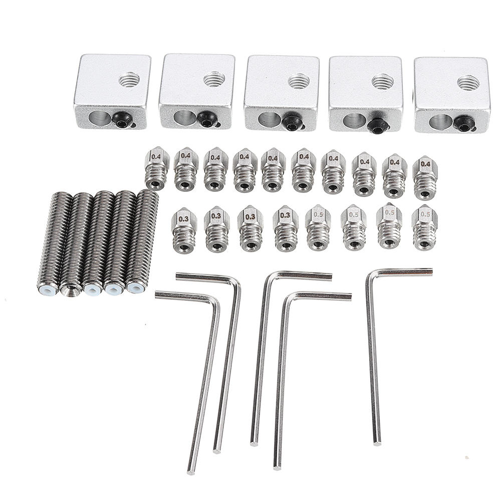 Buse en acier inoxydable 0,3 et 0,4 et 0,5 mm + Bloc de chauffage en aluminium + Gorge de buse M6-30mm + Kit de cle de type L pour filament de 1,75 mm