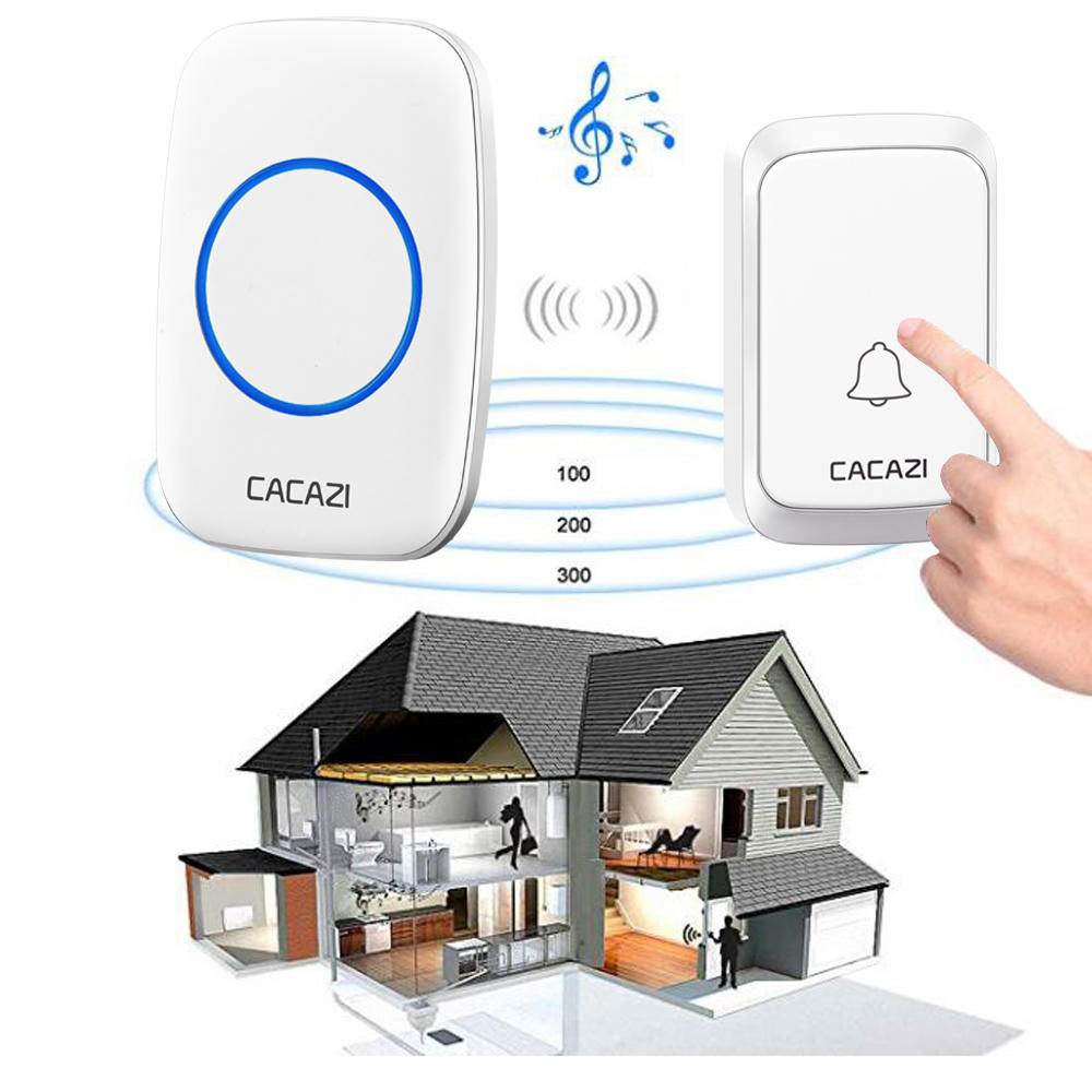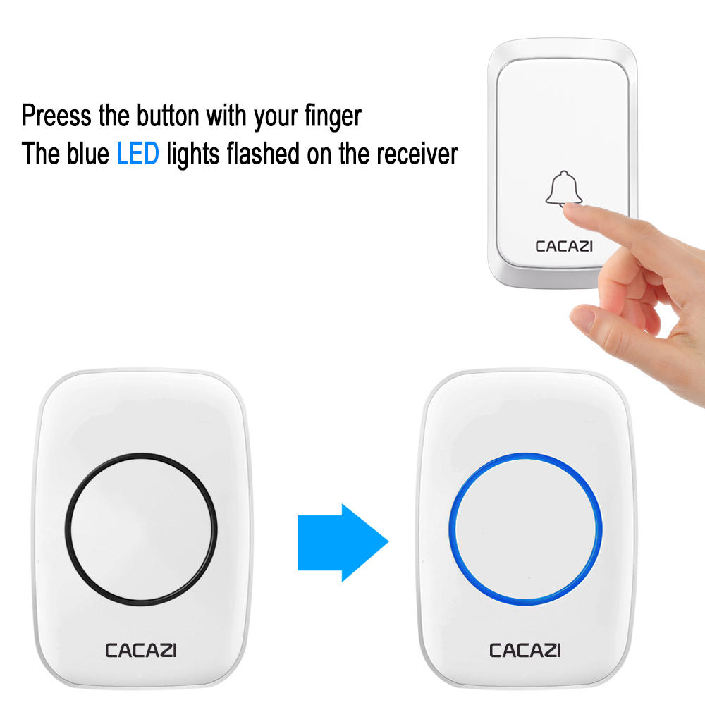CACAZI A60 Sonnette de musique sans fil etanche LED Lumiere Batterie 300M Telecommande d’appel sans fil e domicile Cloche 58 Carillon 2 Bouton 1 Recepteur – Noir Prise americaine