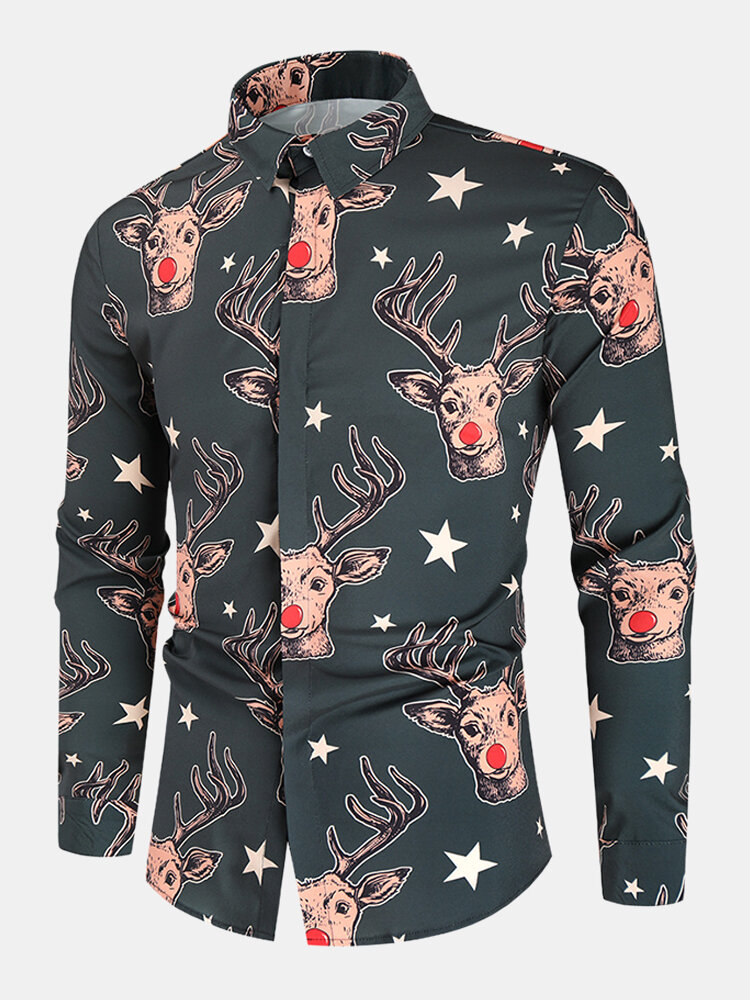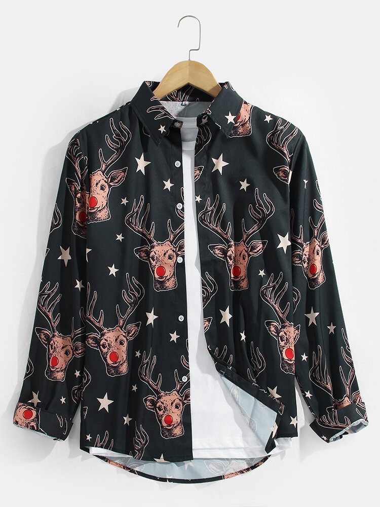 Cartoon Elk Print Long Sleeve Black Shirts For Men – Black 3XL