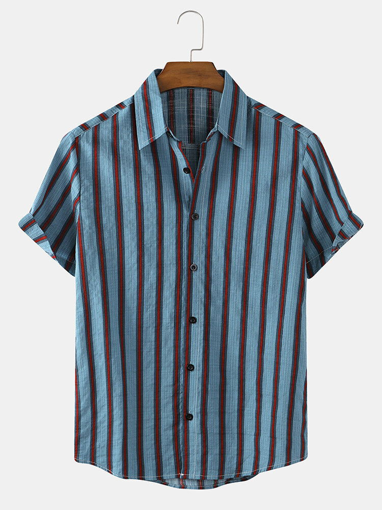 Casual Mens Cotton Vertical Stripes Lapel Collar Mens Short Sleeve Shirts – Light Blue M